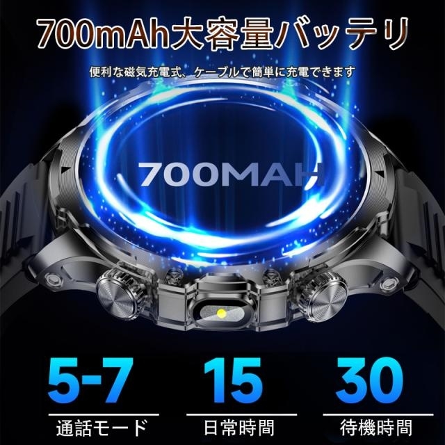 【驚きの700mAhロングバッテリー&色んな機能&パッケージ内容&三ヶ月メーカー保証】この多言語対応のSmart Watchは700mAh大容量バッテリーを搭載され、一回のフル充電で7-15日間持続するバッテリーも魅力です。待機時間は約30日間となり、頻繁に充電する必要がなく、旅行や短期出張先でのバッテリー切れの心配も不要です。(個人の利用状況によっては、持続可能な利用時間が異なります)。そのほかに天気予報、輝度調整、ストップウォッチ、アラーム、スマホを探す、音声アシスタント、世界時計、羅針盤、懐中電灯、ミニゲーム、電卓など様々な便利機能を搭載されております。【パッケージ内容】スマートウォッチ本体×1、バンド×1、USB磁気充電ケーブル、日本語説明書×1【安心保証】 弊店は100%の高品質を追求し、ご購入より安心保証付き、何がご質問とご要望がありましたら、アマゾンの注文履歴にて、お気軽にご連絡お願い致します。※ご使用前に必ず説明書をお読みになり、内容を十分に理解した上で、正しくお使いください。