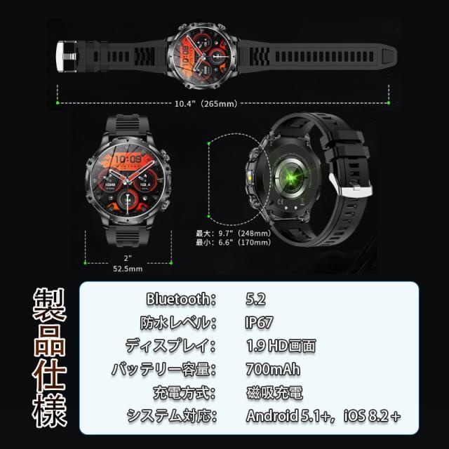 スマートウォッチ【2025新登場 軍用規格 1.9インチ超大画面】iPhone アンドロイド対応 丸型 smart watch 歩数計 活動量計 通話機能付き 100種類運動モード 腕の懐中電灯 耐衝撃 IP67防塵防水 長持ちバッテリー 腕時計 メンズ ギフト 日本語説明書
