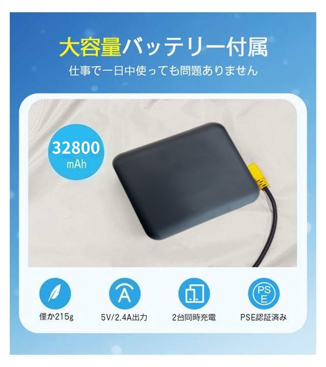 ファン付き作業服は32800mAhの大容量バッテリーが付属し、最大約22時間連続稼働可能です。