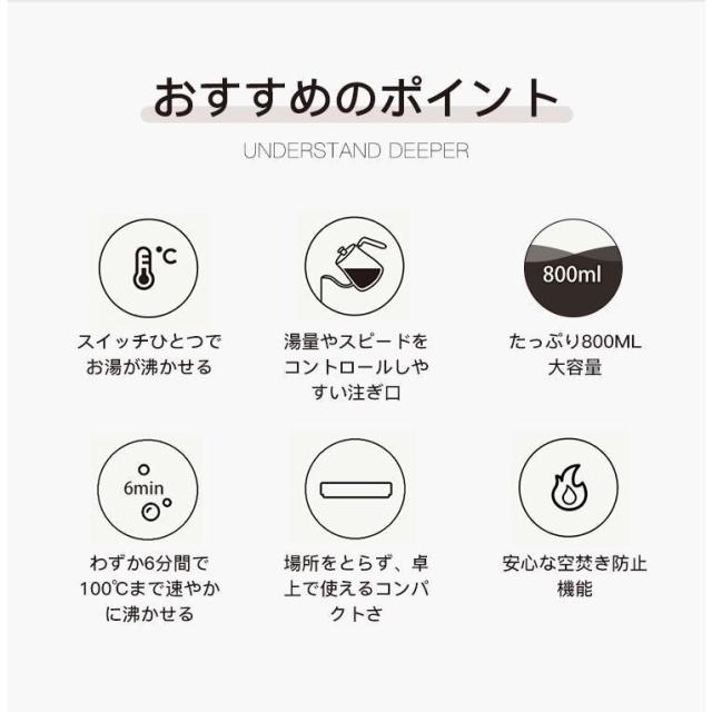 スイッチひとつで沸かせる簡単操作。朝の忙しい時間でも、すぐ沸くので便利です。800mlですぐ沸くので、複数人に一度に対応できます。水の入れすぎを防ぎ、注ぎ口からお湯が吹きこぼれる心配もありません。