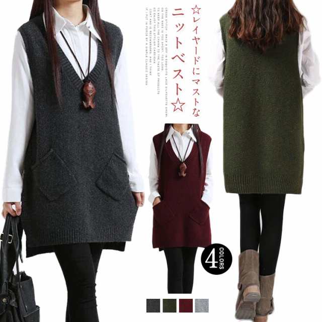 ニットベスト チュニック ロングベスト ニット ベスト ノースリーブ Vネック セーター ノースリーブ レディース ポケット付き スリット Aライン 着痩せ ゆったり 体型カバー 秋冬新作