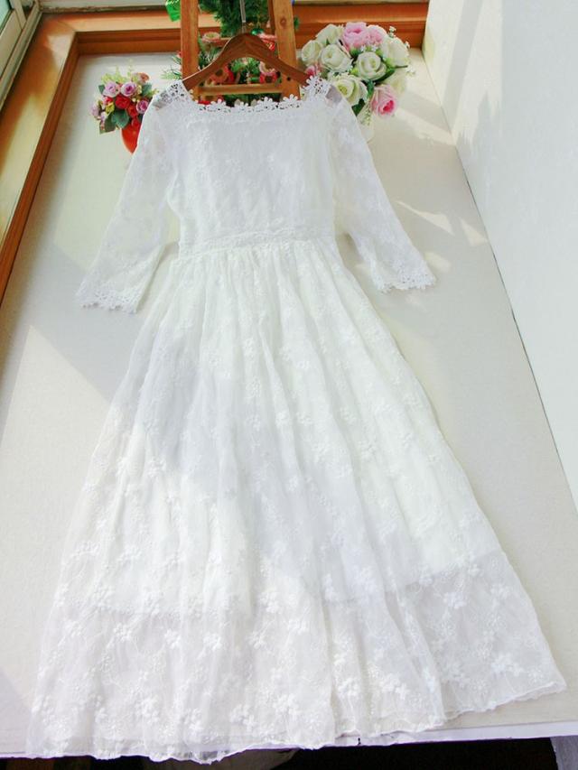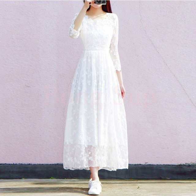 白ワンピース マキシワンピ 7分袖 レース ワンピース レディース リゾート夏ロング丈 ホワイト パーティードレス 結婚式 大人 女性 謝恩会