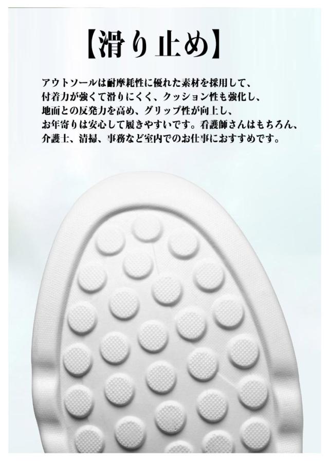 | 【快適】厚いPVCのソールで、弾性が優れた、 衝撃を吸収し、クッション性 がいい、フィット感がいい、長く走りでも足が疲れにくい。 【超軽量】看護師、高齢者やママにぴったりな超軽量ウォーキングジューズ、履きやすくて長時間でも疲れにくい。お年寄りの方やウオーキングシューズとしても幅広く愛用されています。 【滑り止め】アウトソールは耐摩耗性に優れた素材を採用して、付着力が強くて滑りにくく、クッション性も強化し、地面との反発力を高め、グリップ性が向上し、お年寄りは安心して履きやすいです。看護師さんはもちろん、介護士、清掃、事務など室内でのお仕事におすすめです。 【通気性】アッパーはポリエステルメッシュ素材により、高通気、速乾性を実現。足裏も柔らかくて通気性が高いインソールで、汗を早速に排出できます。長時間履いて蒸し暑さなどの不快感を大幅軽減。快適な内部と通気性の足、足を乾燥した状、歩きやすくなります。 【用途】運動、仕事、通学など、散歩や買い物など、スーパーやショッピングモールへのお出かけ用にも、最適です。年齢を問わず、若者でも中高齢者でも相性が抜群です。ナース/看護師など、立ち時間が長い仕事をする人もおすすめです。ウォーキングはもちろん、普段使いにもバッチリなウオーキングシューズです。 | |