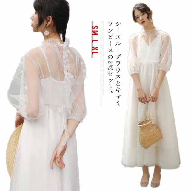 シースルーブラウス付き!キャミソールワンピース ロング ワンピース リゾートワンピース 白ワンピース ロング マキシ ノースリーブ vネック