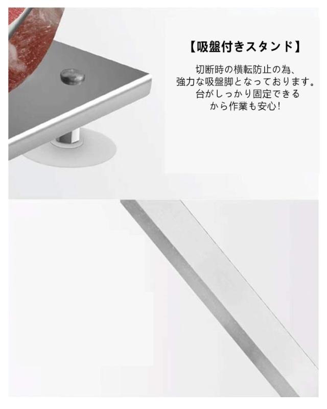 | さまざまな食材から冷凍食品までスライスできる器具です。 【振動と騒音を避ける】手動冷凍肉切断機は、野菜を切る過程で振動と騒音を効果的に回避できます。 【異なる厚さの肉をカット】ノブを少し回すだけで、肉の厚さを調整できます。操作もお手入れも簡単です。 【吸盤付きスタンド】切断時の横転防止の為、強力な吸盤脚となっております。台がしっかり固定できるから作業も安心! 【丸洗い可能】ステンレス素材の為、錆びにくくシンプルな設計により丸洗い可能。 【幅広い用途】手動冷凍肉カッターは、鍋、寿司、ピザ調味料、サンドイッチ、生姜の準備など、冷凍肉をさまざまな用途にカットするのに役立ちます。 | |