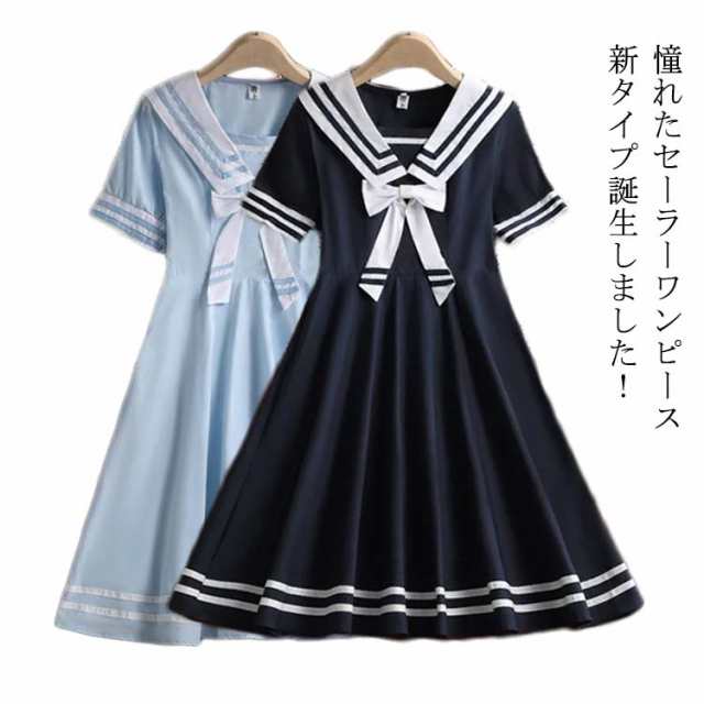 子供服 ワンピース セーラー リボン付き ミモレ丈ワンピース セーラー襟 セーラーワンピース ロングワンピース 半袖 ライン入り 制服 女の子 高校生 中学生 可愛い 春 夏 ブルー ネイビー 110cm 120cm 130cm 140cm 150cm 160cm 170cm