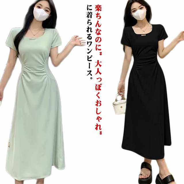 レディース ロングワンピース 半袖 ワンピース 体型カバー ロンT 半袖ワンピース Aライン ミモレワンピース 半袖ワンピース 春夏 ロング丈tシャツ マキシ丈 着やせ ワンピ クルーネック 大きいサイズ フェミニン カジュアル ブラック 夏 春 夏服