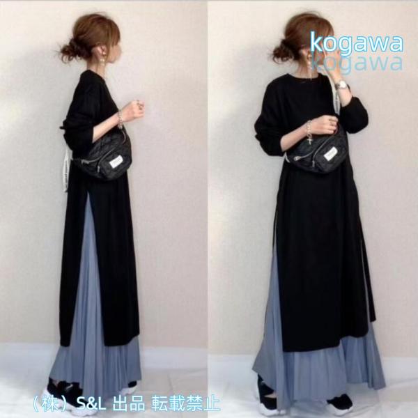 セットアップ ワンピース スカート ロングワンピース フレアスカート 2点セット S&L レディース 秋物 秋冬 長袖 ゆったり スリット Vネック ウエストゴム 大人