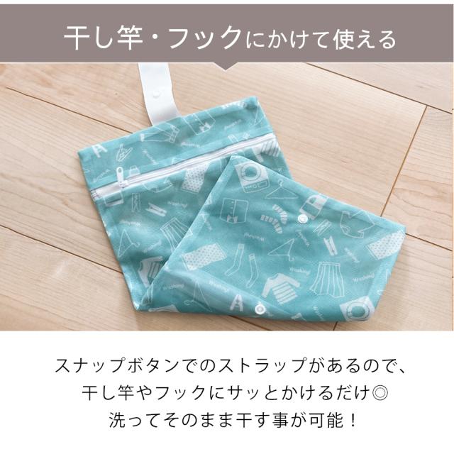 スナップボタン付きストラップで洗濯機やフックに簡単に吊り下げられるので、