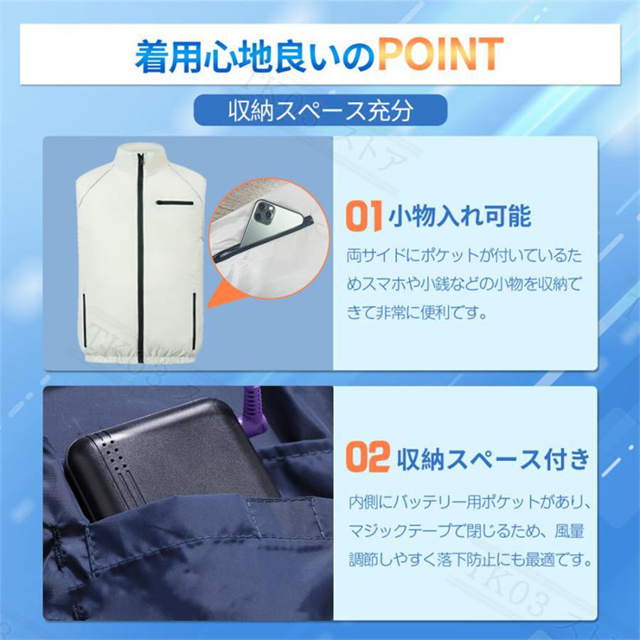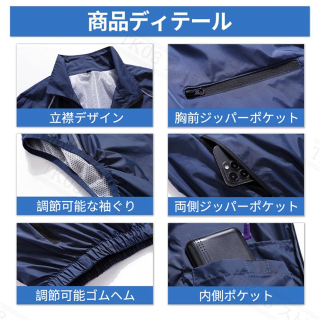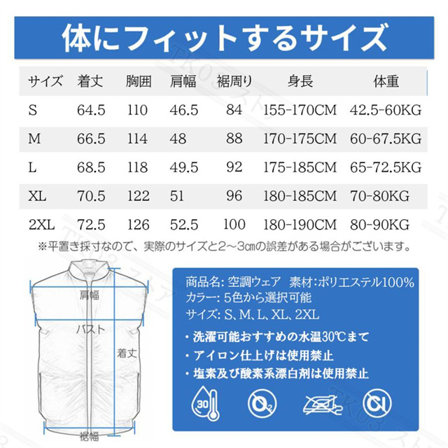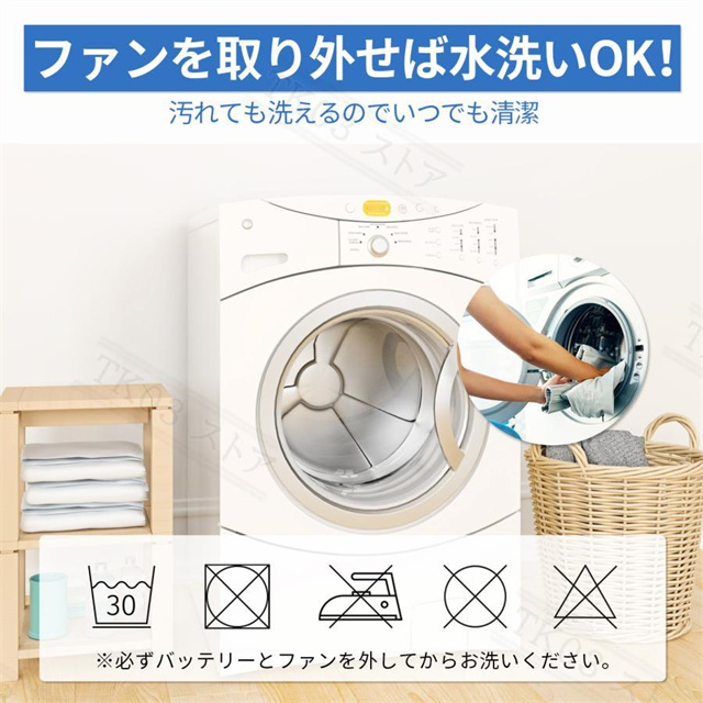 電気部品は簡単に取り外し可能です。服は洗濯機でお洗濯が可能です。 洗濯前に、電池、扇風機、電源ケーブルを取り外してください。水においてないようにしてください。