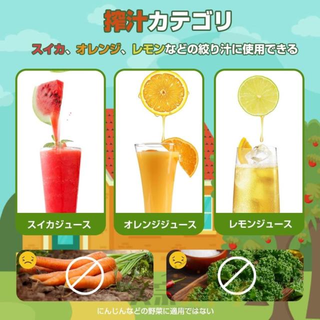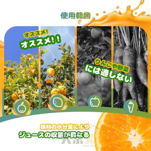 低温、低速プレス:果肉と果汁の分離、栄養の吸収が速く、より十分です。柑橘系果物などの苦みは抽出せず、美味しいジュースだけを押し搾ります。