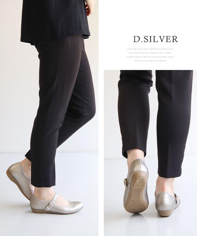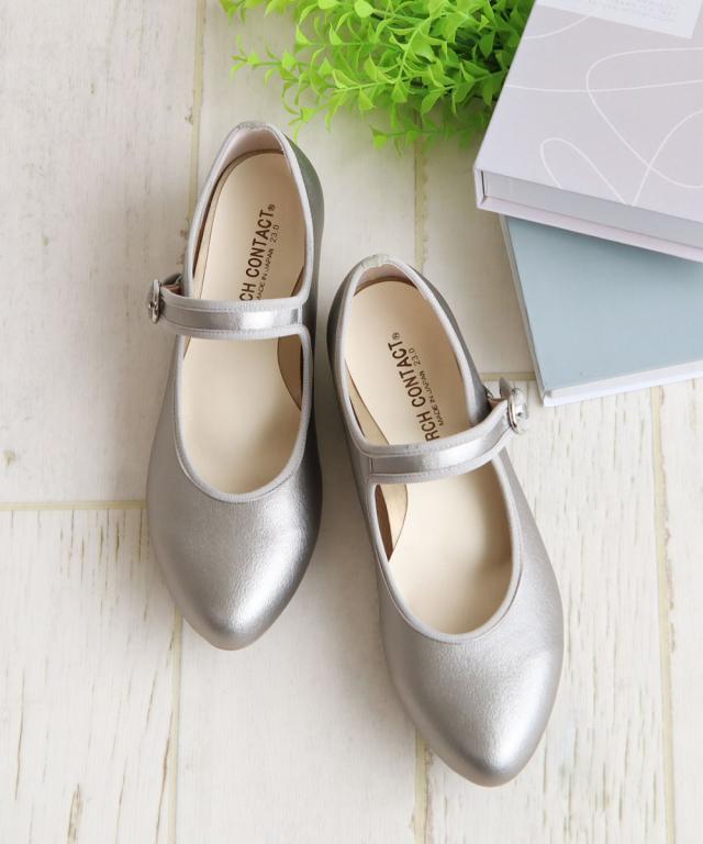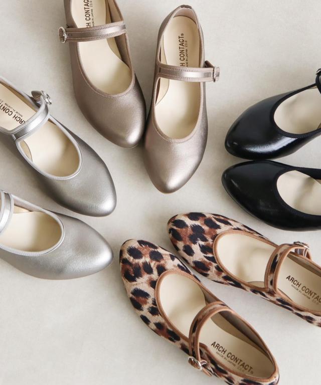 女性的なシルエットを演出するアーモンドトゥに、細身の甲ストラップが魅力的なメリージェーン。