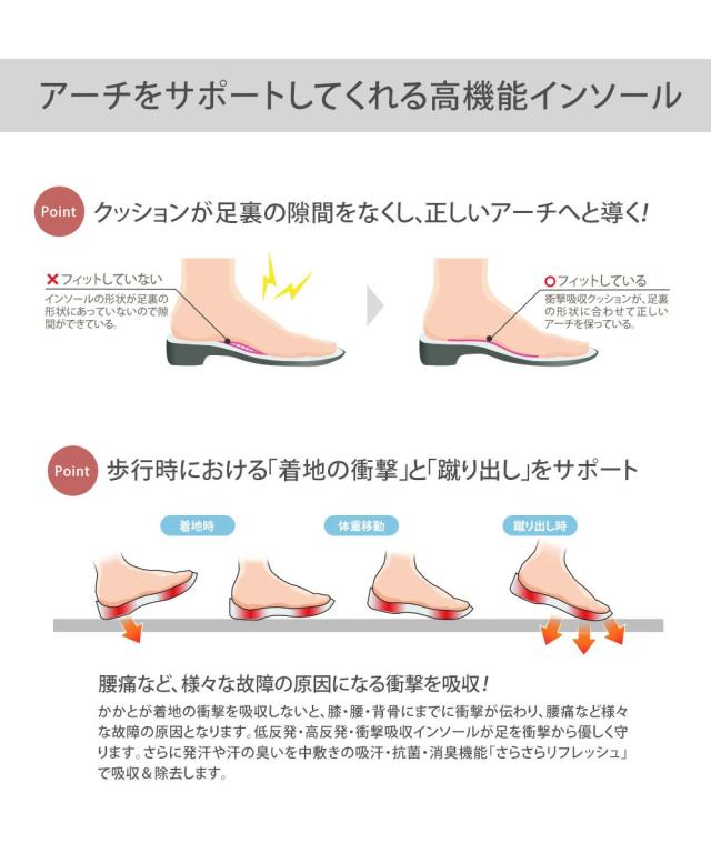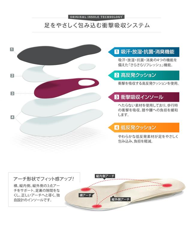クラボウの衝撃吸収荷重分散機能を有した低反発ウレタンフォーム「マザータッチ」を採用したインソールが足をふんわりと包み、足の疲れを軽減します。