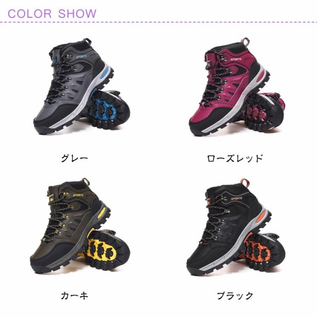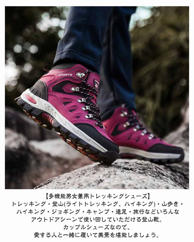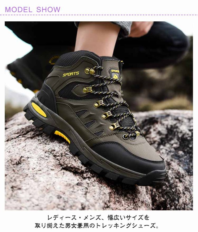 | レディース・メンズ、幅広いサイズを取り揃えた男女兼用のトレッキングシューズ。 【防水&つま先保護&衝撃吸収&通気】アッパーはPUを使用して通気性、撥水透湿性に優れ、水の浸入を許さず、内部のムレを軽減する。快適で通気性のよいメッシライニルグ。ゴム素材を採用した深溝パターンのハイグリップアウトソールで、クッションを保ちながら、滑りにくくて耐磨耗性が良い。完全防水(※長時間の浸水等にはご注意ください。) 【アウトドア専用トレッキングシューズ】山登りを目指す、気楽な履き心地を求めるように、優れた防水耐久性、衝撃吸収性性、透湿性を兼ねそろえており、アウトドア専門家や本格的愛好家の高度なニーズを満たします。登山初心者の方にも最適。足への負担や疲れを軽減させるデザインで、長時間のトレッキングや低登山にも対応します。 【多機能男女兼用トレッキングシューズ】トレッキング・登山(ライトトレッキング、ハイキング)・山歩き・ハイキング・ジョギング・キャンプ・遠足・旅行などいろんなアウトドアシーンで使い回していただける登山靴。カップルシューズなので、愛する人と一緒に履いて美景を堪能しましょう。 | |