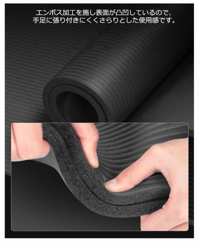 | 幅広(200cm*90cm)で極厚(15mm)のヨガマット!持ち運びに便利な【収納ケース&ゴムバンド付き】! 極厚15mm!クッション性抜群優しい弾力のNBRを採用!クッション性が高くひざやひじをついても痛くなりにくく快適にトレーニングが行えます。 汗や水分が染み込みにくい素材で濡れてもさっと拭けて清潔に使えます。 エンボス加工を施し表面が凸凹しているので、手足に張り付きにくくさらりとした使用感です。 約200cm×90cmのゆったりサイズなので様々なヨガのポーズや寝転がってのトレーニングにも対応! 厚みのあるマットによって床の保護や騒音を軽減してくれます。 持ち運びに便利な収納ケース&ゴムバンド付き!収納ケースとゴムバンドがセットなのでヨガ教室にも持ち運び楽々!また軽量なので手軽に持ち出せます。 ヨガ教室での使用はもちろん!自宅でのヨガやピラティス、ストレッチ、リラックスタイムなど様々なトレーニングにも使えます。 | |