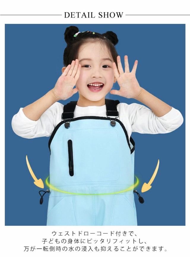 | 水中に座って遊んでも水の侵入がしない子ども用ウェーダー。 いつもキッズウェーダーと違って、胸元も背中もしっかりカバーしてくれるキッズウェーダー、お子様が思い存分水遊びや潮干狩り楽しめます。 ウェストドローコード付きで、子どもの身体にピッタリフィットし、万が一転倒時の水の浸入も抑えることができます。 表は高品質のpvc生地、裏側は透湿性に優れ、さらりとしたニット素材で、長時間使用しても蒸れない快適な着心地を実現するチェストハイウェーダーです。 肩ストラップは簡単に長さ調整が可能で、成長に合わせて長く使用できる設計です。お子様の動きやすさを考慮した伸縮性素材で、長時間の着用でも疲れにくい構造! 大きめの三つポケット付きで小物の収納が可能!ラジアルソールを採用し、滑りやすい場所でも安定した歩行をサポートします。 キラキララメが煌めくブラックカラーの一体型ブーツ、汚れが目立ちにくく、お洒落のも嬉しいポイントです。 釣り、砂掘り、砂遊び、泥遊び、スライムや粘土遊び、工作、室内、屋外、砂場、ビーチ、海水浴場、浅瀬、公園、子供用プールなど、様々なシーンで大活躍! | |