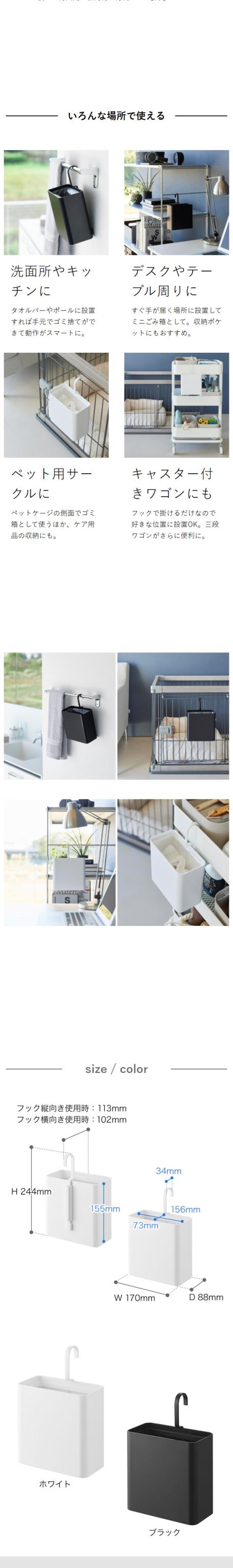 掛ける向きを変えられる フック付きゴミ箱 『 tower( タワー )引っ掛けられるゴミ箱 』は、手元の高さで壁面設置できる小さめのダストボックスです。1.8Lのコンパクトな容量で、ポールやバーに引っ掛けるための便利なフック付き。フックの向きは90度ずつ4方向に差し替えられるので、リビングや書斎、洗面所のタオルバー、ペットケージ、ワゴンなど掛ける場所に合わせた向きで設置できます。ゴミをいれやすい蓋なしで、内側にポリ袋を隠せる袋止めリング付き。使う場所を選ばない、モノトーンのすっきりとした角型デザインです。