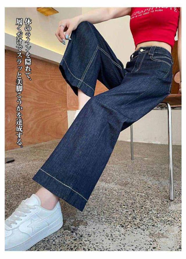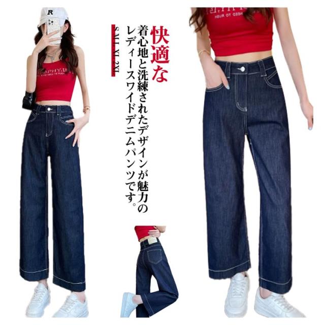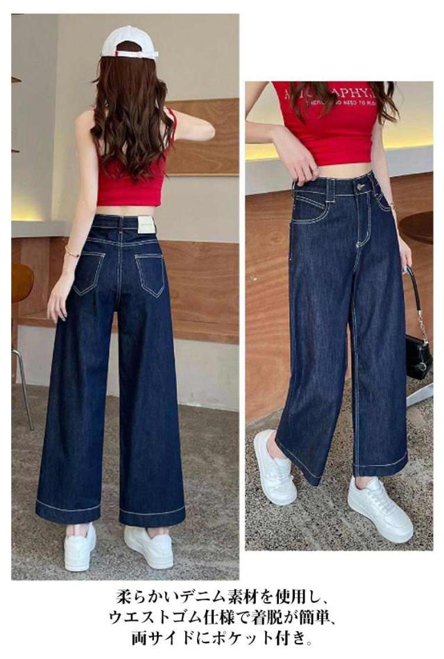 薄手 デニムパンツ 春 ウエストゴム 夏 ワイドパンツ 9分丈 レディース ジーンズ ボトムス ストレート ハイウエスト ゆったり 体型カバー きれいめ 大きいサイズ