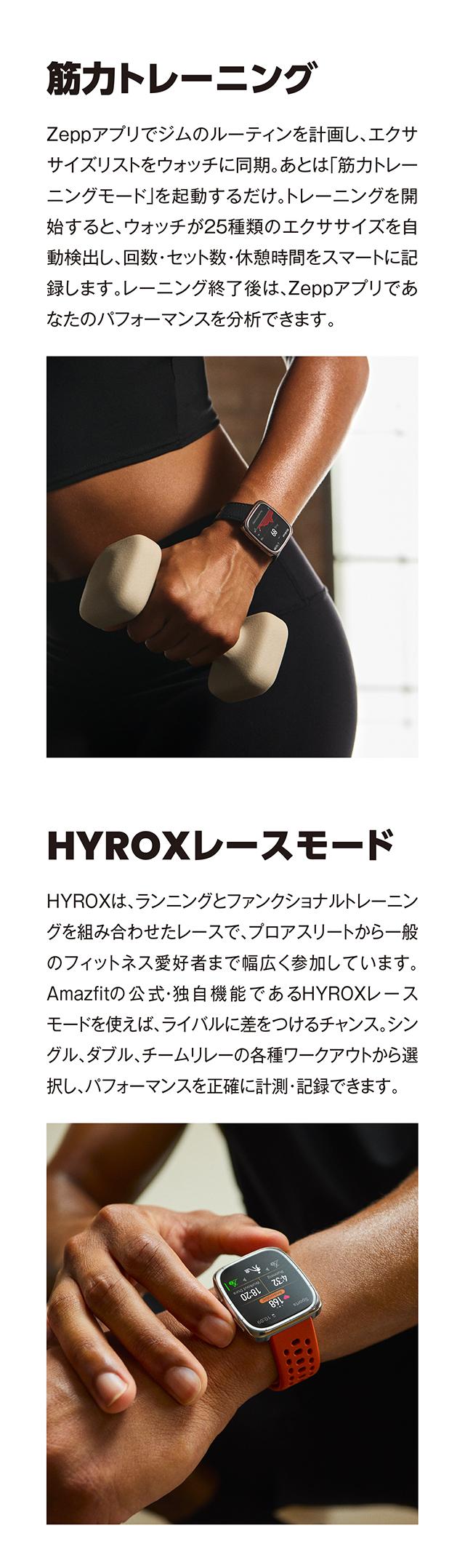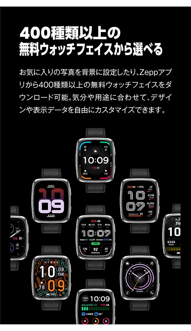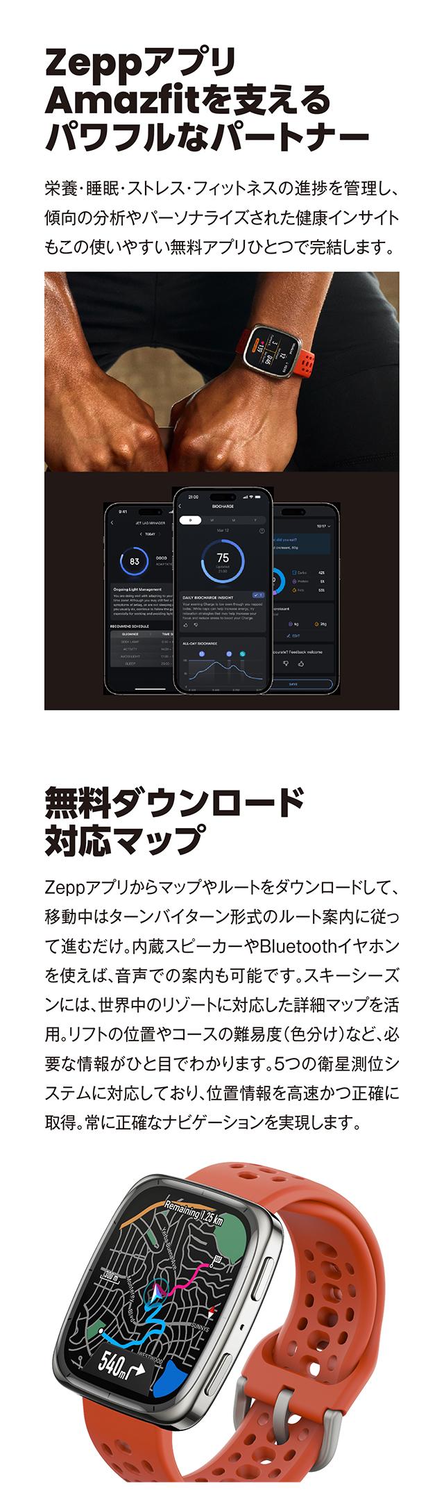 | 仕様 | 日常生活用防水(5気圧) バッテリー容量:260mAh 通常使用時:最大10日間 ディスプレイ素材:AMOLED サイズ:1.75 解像度:390×450 BioTracker 6.0PPG生体センサー 加速度センサー、ジャイロスコープ、温度センサー、環境光センサー、地磁気センサー、気圧高度計センサー 接続:Bluetooth 5.2 BLE 5衛星システム(GPS、GLONASS、Galileo、BDS、QZSS) 使用可能機種:Android 7.0以上、ios 14.0以上 アプリケーション:Zepp App マイク機能 スピーカー機能 |