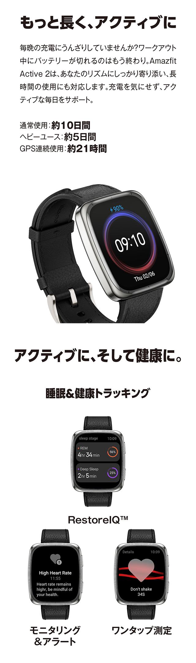 正規品 アマズフィット プレミアムバージョン Bluetooth 替えベルト メンズ レディース スマートウォッチ SP170075-C01 Amazfit Active 2 Square デジタル シルバー ブラック 黒 ◆Amazfit Active 2 Squareは、サファイアガラスと本革レザーバンドを採用した高級感のあるモデル。スタイリッシュなデザインとライフスタイルを実現します。160種以上のワークアウトモードに対応し、10日間のロングバッテリーを搭載。新しい睡眠アルゴリズムの採用で睡眠検出の精度を高めるとともに、レディネスの精度も向上。Zepp Flowを使用すると、音声で時計を操作できます。Zepp OSキーボードを使用して書面による返信を入力したり、内蔵マイクとスピーカーを使用してBluetooth通話を発信および受信することができます。
