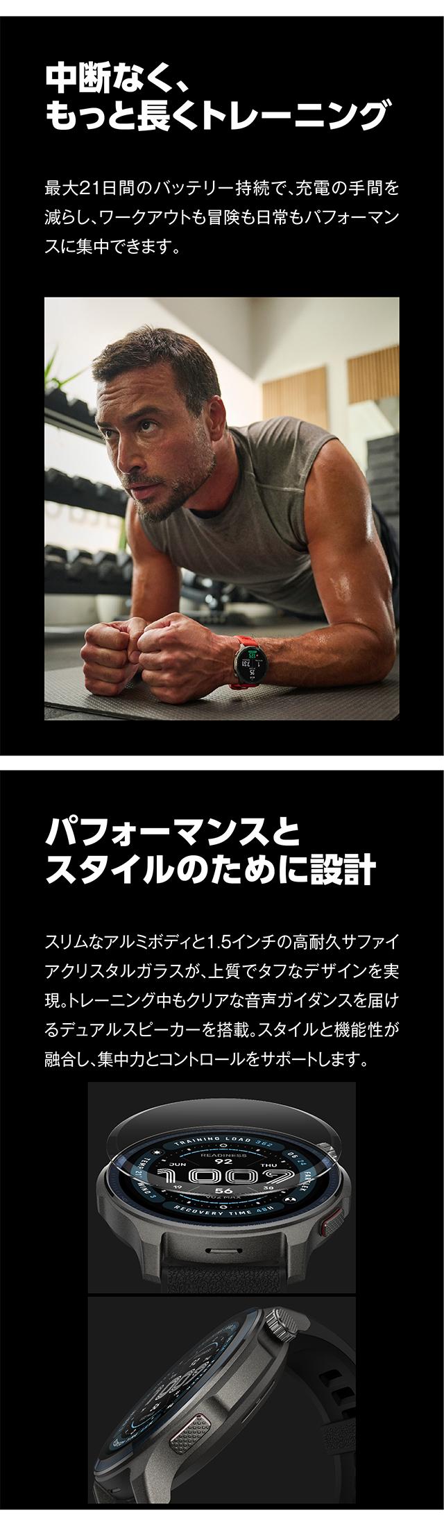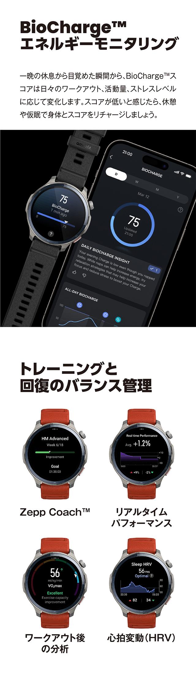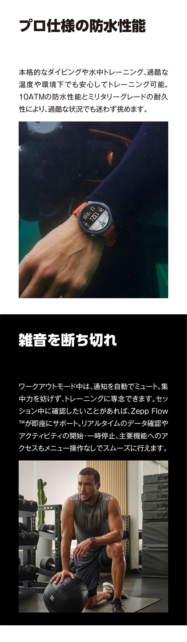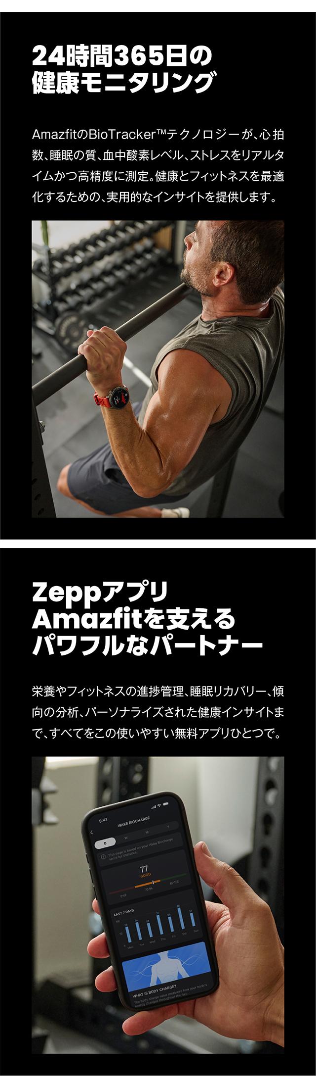 | 仕様 | 日常生活用強化防水(10気圧) バッテリー容量:658mAh 通常使用時:最大21日間 ディスプレイ素材:AMOLED サイズ:1.5 解像度:480×480 BioTracker 6.0PPG生体センサー 加速度センサー、ジャイロスコープ、温度センサー、環境光センサー、地磁気センサー、気圧高度計センサー 接続:Bluetooth 5.2 BLE 6衛星システム(GPS、GLONASS、Galileo、BDS、QZSS) デュアルバンド円偏波アンテナ技術 使用可能機種:Android 7.0以上、ios 14.0以上 アプリケーション:Zepp App マイク機能 スピーカー機能 |