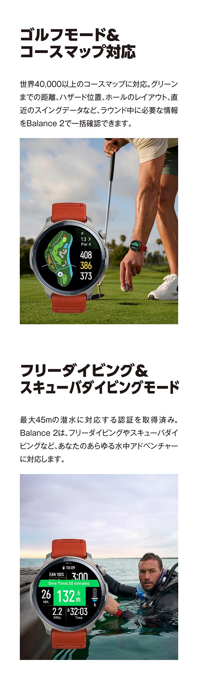 正規品 アマズフィット Bluetooth 替えベルト メンズ レディース スマートウォッチ SP170076-C01 Amazfit Balance 2 デジタル シルバー ブラック 黒 ◆Amazfit Balance 2は、最高級の素材を採用した、スタイリッシュで洗練されたデザインで、マルチスポーツに対応したプレミアムスマートウォッチです。Golfラウンド機能を搭載。世界中の40,000コースのマップをダウンロード可能。グリーンまでの距離、ハザード、ホールのレイアウト、最後のスイング指標など、ラウンド中のゴルフ完全体験を提供します。10ATMの耐水性とミリタリーグレードの耐久性により、激しいトレーニングでも躊躇する必要はありません。あらゆるフリーダイビングやスキューバダイビングに対応。21日間のロングバッテリー、6衛星測位システムGPS、方向転換を示すオフラインマップ機能を搭載しています。