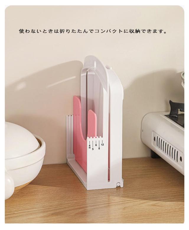 | 5種類の厚さにカットできる食パンスライサーです。 ホームベーカリーで作った食パンや高級食パンなどを4枚切り、5枚切り、6枚切り、8枚切り、12枚切りの5種類の厚さにカットできます。 カットしやすい目盛り付き。 左右どちらの向きでも使えます。 使わないときは折りたたんでコンパクトに収納できます。 フック穴付きなので、吊り下げ収納も可能です。 | |