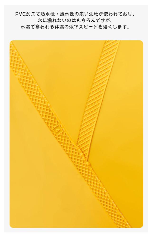 | 透湿防水素材であるPVCを採用した漁業作業や掃除や釣りなどにピッタリなサロペットです。 溶着強度に優れた生地は大変丈夫なため、耐寒性・耐摩擦性・耐剥離性を備え、厳しい作業環境に耐えることができます。 PVC加工で防水性・撥水性の高い生地が使われており、水に濡れないのはもちろんですが、水温で奪われる体温の低下スピードを遅くします。 足から胸までを覆う部分に防水性・撥水性の高い生地が使われており、履くだけで体が濡れるのをしっかり防ぐことができます。 ブーツとズボンは縫い合わせるのではなく、一体化でつくられており、水漏れはしません。通気性もよいこの胴長ウェーダーをはき、渓流に入っても体を乾燥的に保ちます。 防滑ソールを採用しており、バス釣りや防波堤には最適です。靴裏は厚底になっており踏みつけ怪我の防止になります。 様々な場所で活躍:川釣り、潮干狩り、水産加工場、魚市場での現場作業着に、また、田植えや草刈りなど農作業や雪掻き。 海に川に湖に!釣りをするなら必須アイテム!便利なポケット付き。 | |