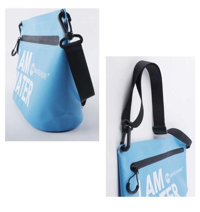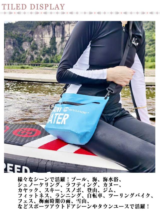 | 防水性・耐久性 ドライバッグ。 防水性の高いPVC生地を使用! 様々なシーンで活躍!プール、海、海水浴、シュノーケリング、ラフティング、カヌー、カヤック、スキー、スノボ、登山、ジム、フィットネス、ランニング、自転車、ツーリングバイク、フェス、梅雨時期の雨、雪山、などスポーツアウトドアシーンやタウンユースで活躍! | |