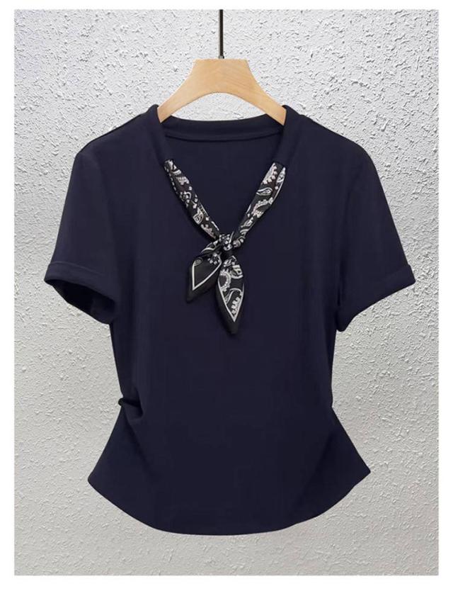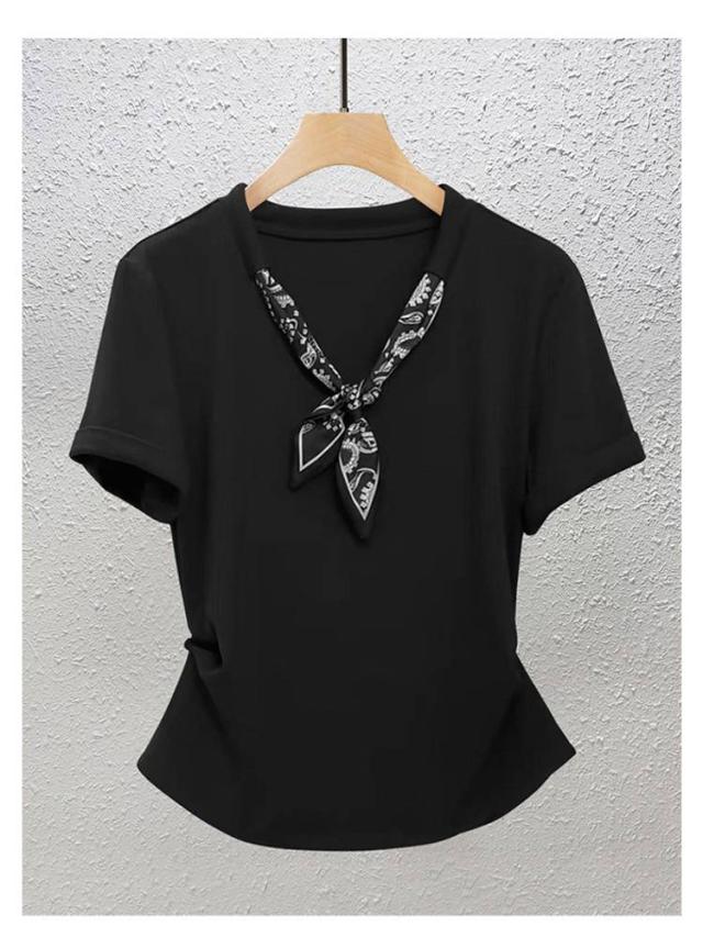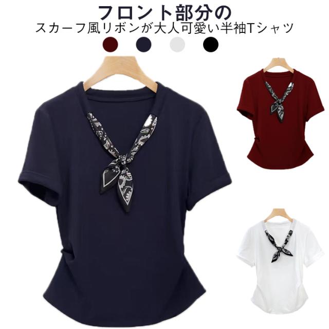 トップス クロップド丈 tシャツ ショート丈 接触冷感 おしゃれ tシャツ カットソー ボウタイtシャツ 半袖 ボウタイtシャツ リボンタイ レディース ストレッチ 可愛い 夏 薄手 カジュアル 無地 普段着 オフィス 通勤 OL ネイビー ホワイト ブラック