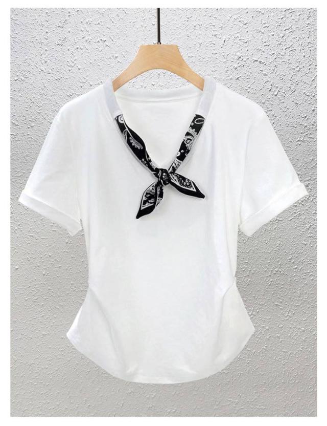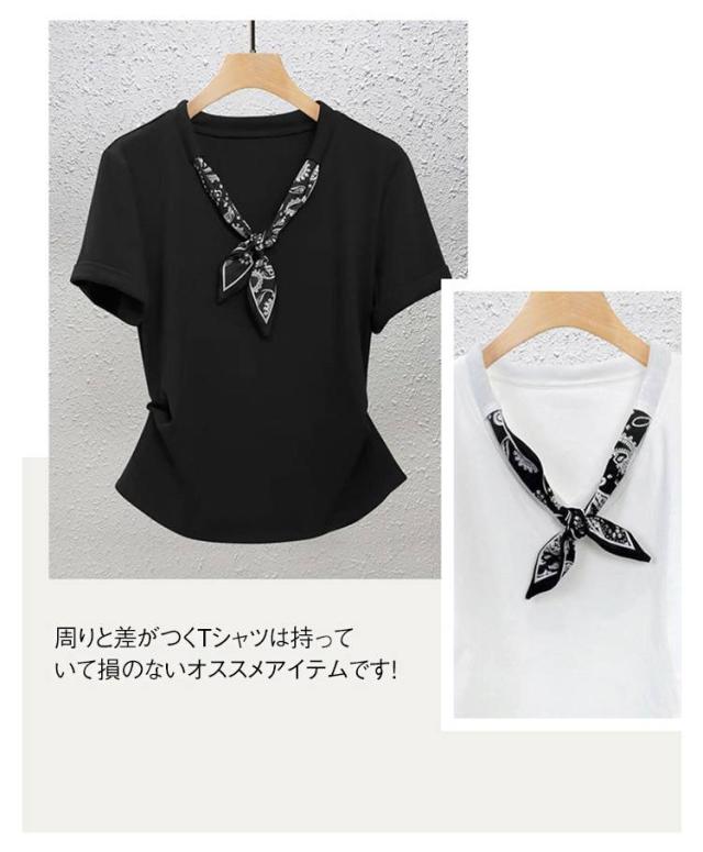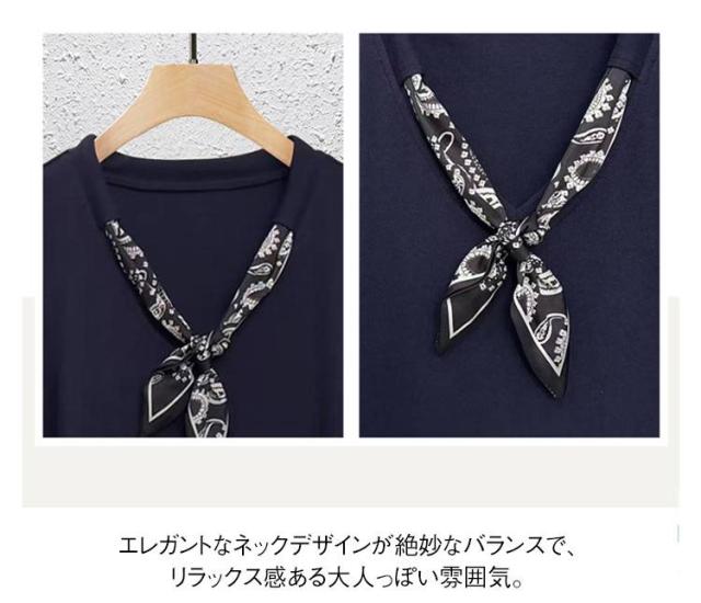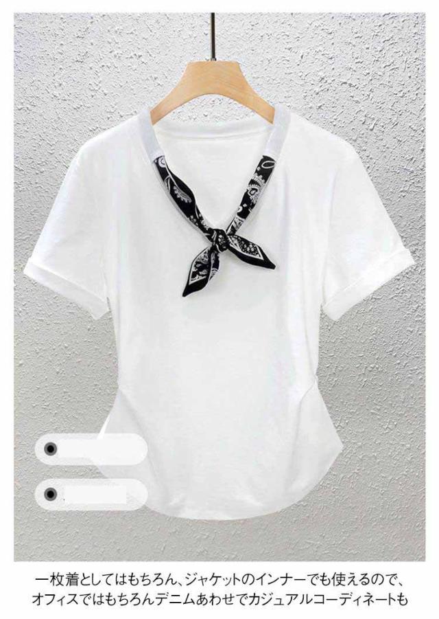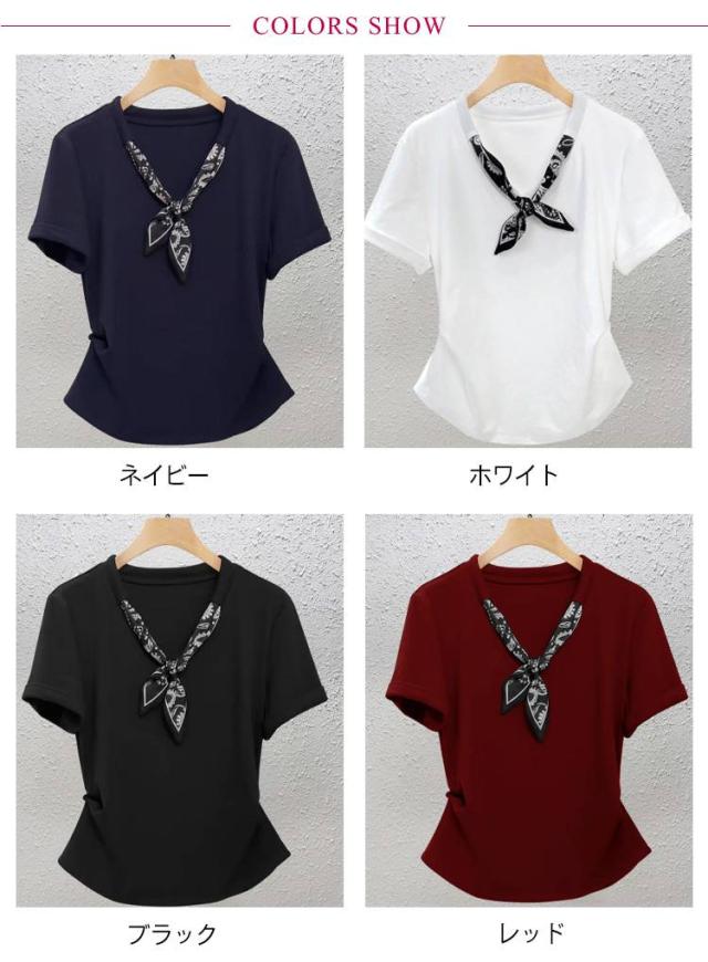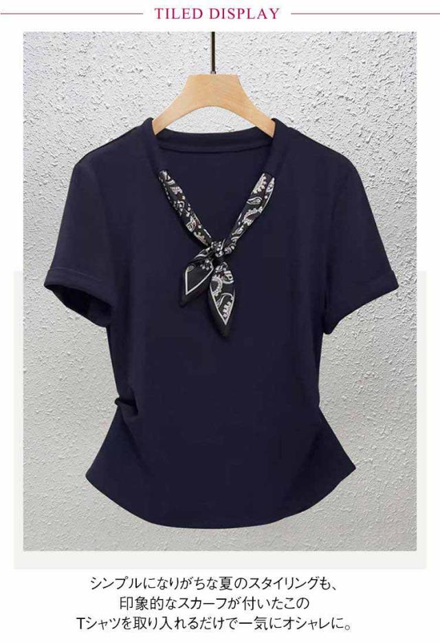 | フロント部分のスカーフ風リボンが大人可愛い半袖tシャツ◎ エレガントなネックデザインが絶妙なバランスで、リラックス感ある大人っぽい雰囲気。 シンプルになりがちな夏のスタイリングも、印象的なスカーフが付いたこのTシャツを取り入れるだけで一気にオシャレに。 一枚着としてはもちろん、ジャケットのインナーでも使えるので、オフィスではもちろんデニムあわせでカジュアルコーディネートも◎ 周りと差がつくTシャツは持っていて損のないオススメアイテムです! | |