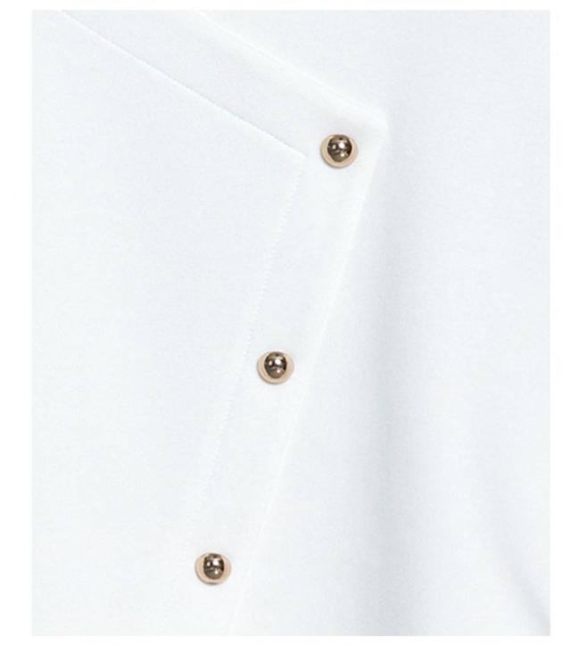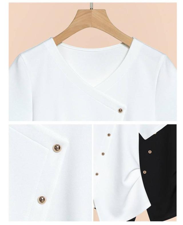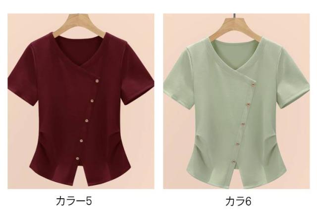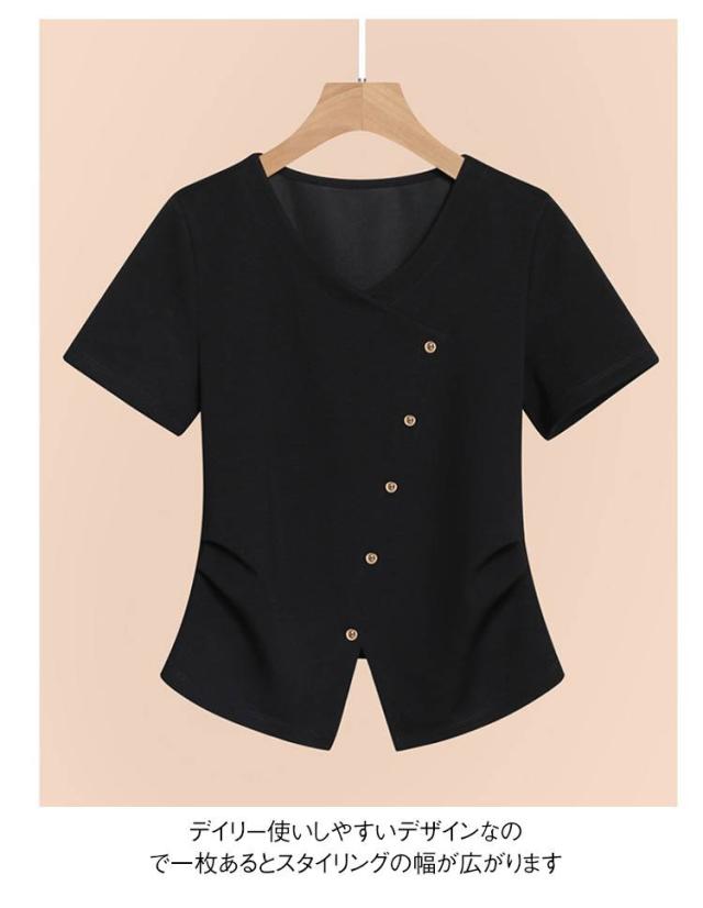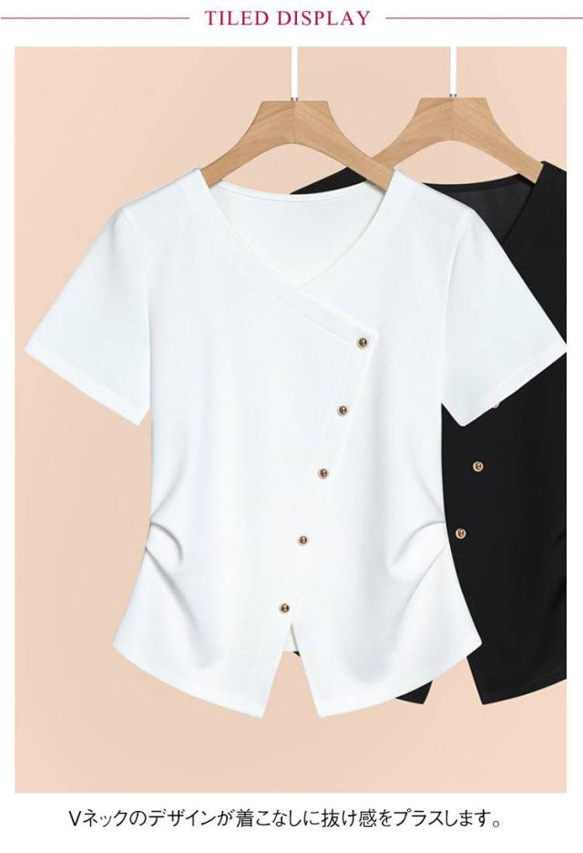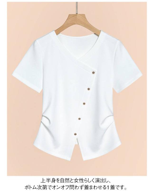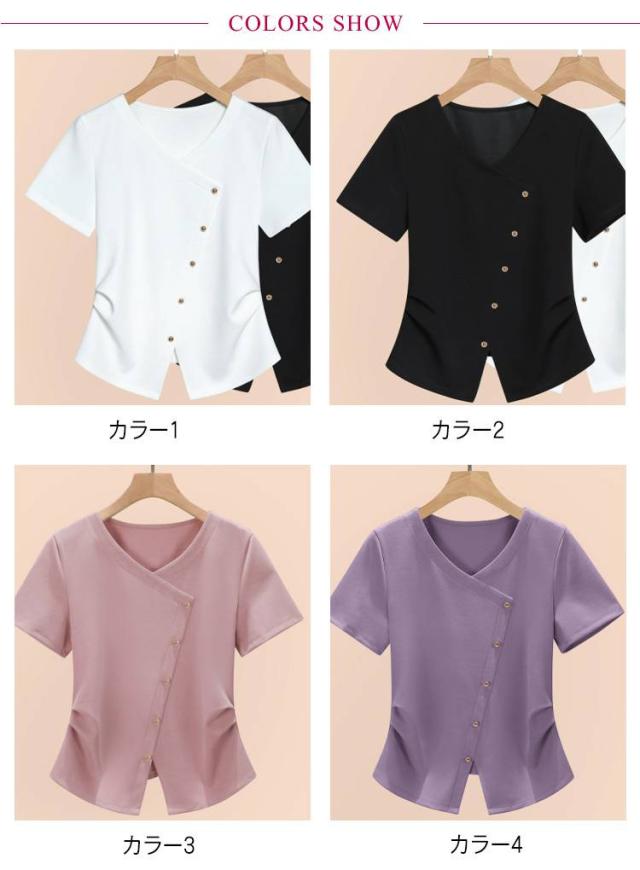 カジュアル 半袖 レディース カットソー アシンメトリー tシャツ トップス tシャツ 夏 半袖 tシャツ トップス 涼しい スリット入り 透けにくい 金ボタン 透けない きれいめ 仕事 オフィス シンプル 半袖 無地