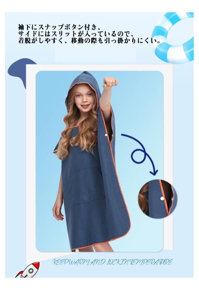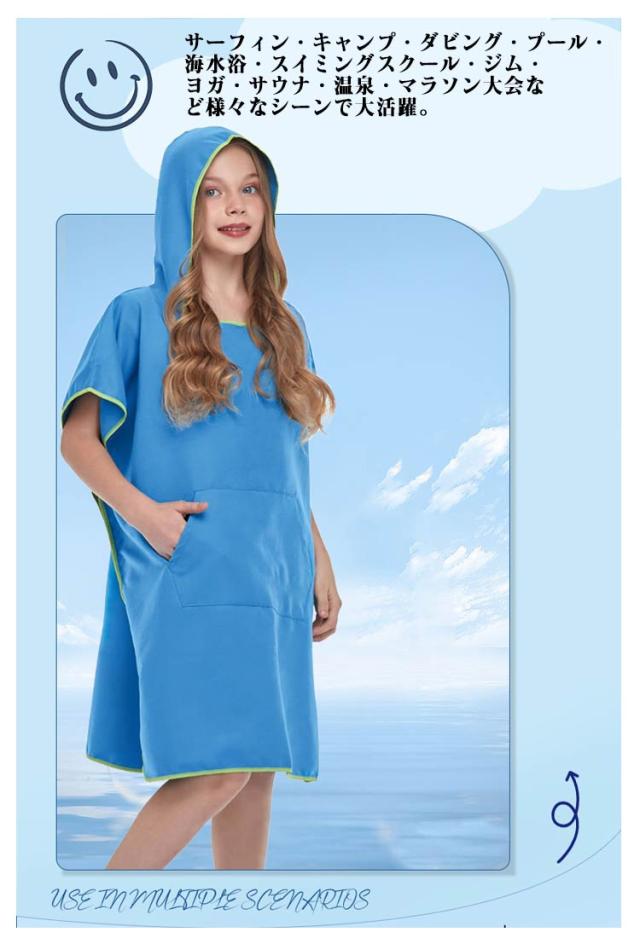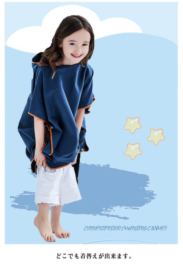 | お着替えポンチョ。海水浴・プールの必需品。どこでも着替えが出来ます。 吸水速乾性の肌触りの良いマイクロファイバー生地。体温調整にも最適です。速乾性と吸水性があり、水着やウェットスーツからの着替えの際には体を温めるバスタオル替わりとしてもお使いいただけます。 フード付きなので、日焼け防止になり濡れた髪を拭くこともできます。海、プール、マリンスポーツなどにぴったりなアイテムです。 裾にスリット入り!袖下にスナップボタン付き、サイドにはスリットが入っているので、着脱がしやすく、移動の際も引っ掛かりにくい。 男女兼用のオーバーデザイン。 コンパクトに畳めばで持ち運びラクラク! 濡れた体を拭いたり、汗を拭いたり、少しだけ寒い時に適しています。サーフィン・キャンプ・ダビング・プール・海水浴・スイミングスクール・ジム・ヨガ・サウナ・温泉・マラソン大会など様々なシーンで大活躍。お部屋でお風呂上がりのバスローブとして、災害などの着替えでもご利用いただけます。 | |