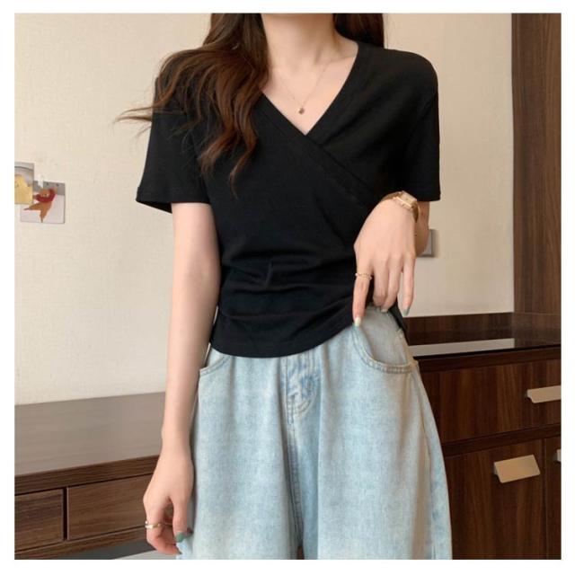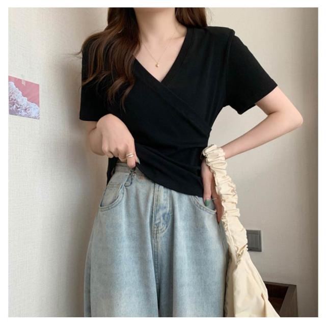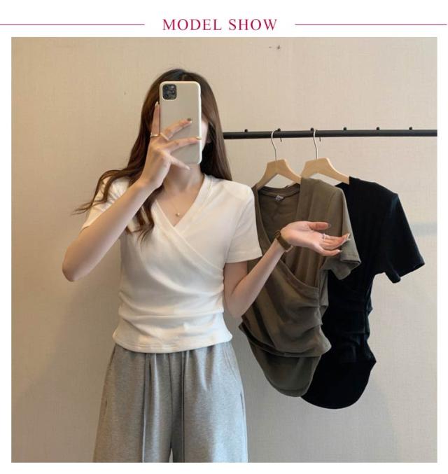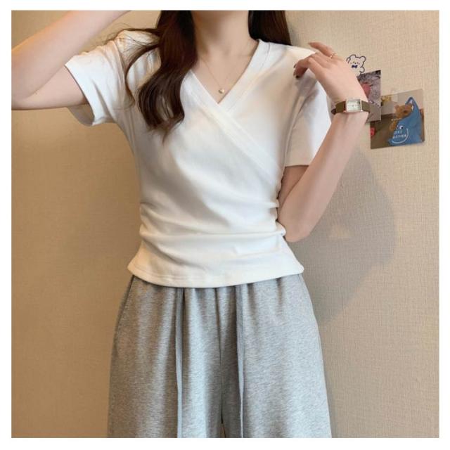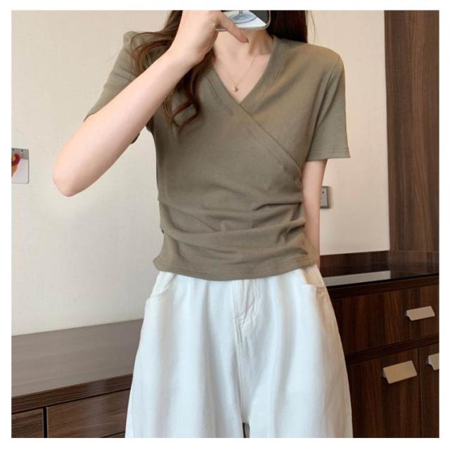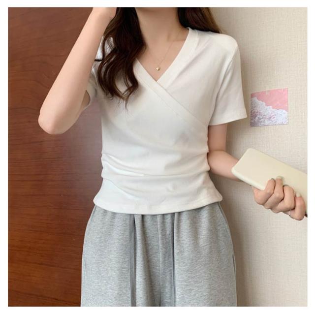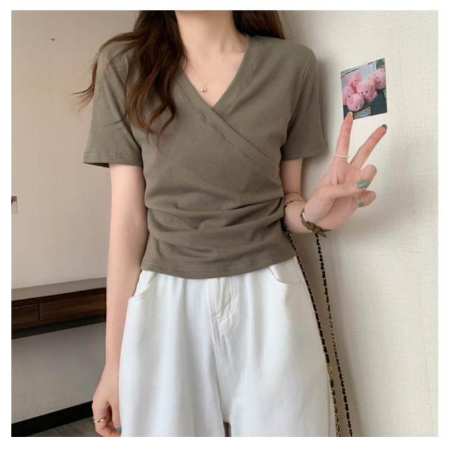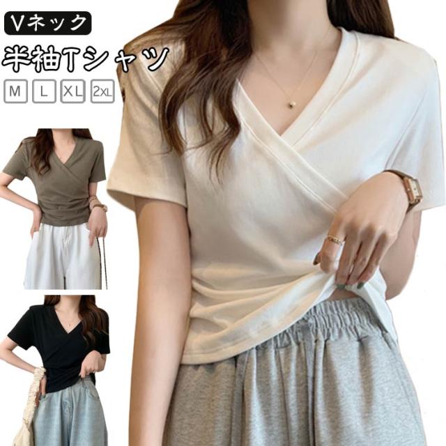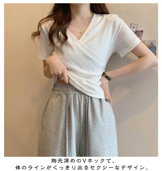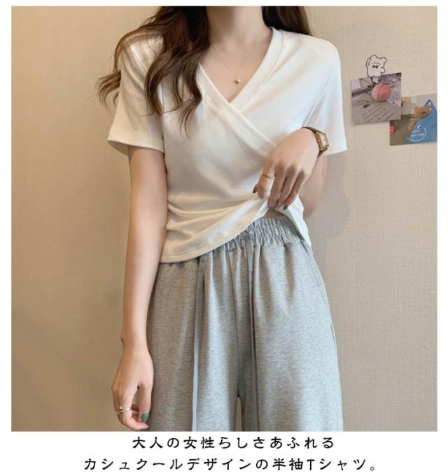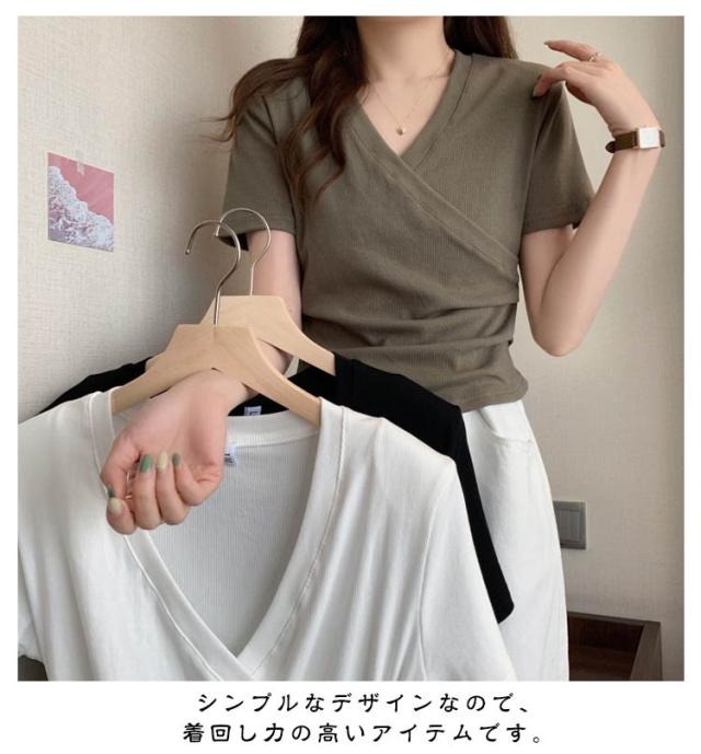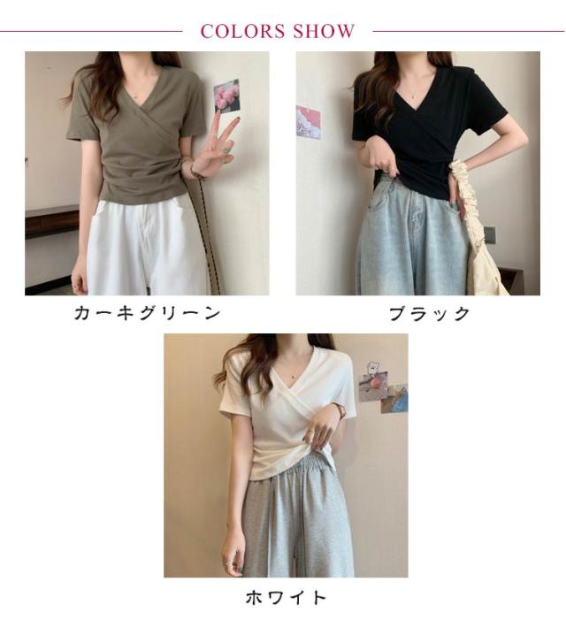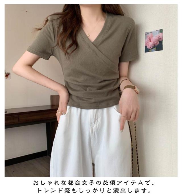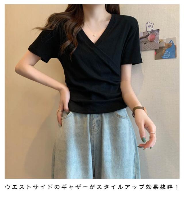 ミニ丈 ギャザー カットソー 半袖 Vネック カシュクール フェミニン ウエストマークショート丈 カットソー Vネック tシャツ カシュクール カシュクールtシャツ トップス 半袖tシャツ 大人可愛い 高見え 着回し 通勤 おでかけ
