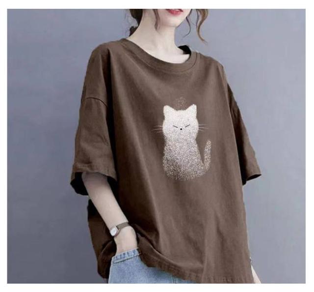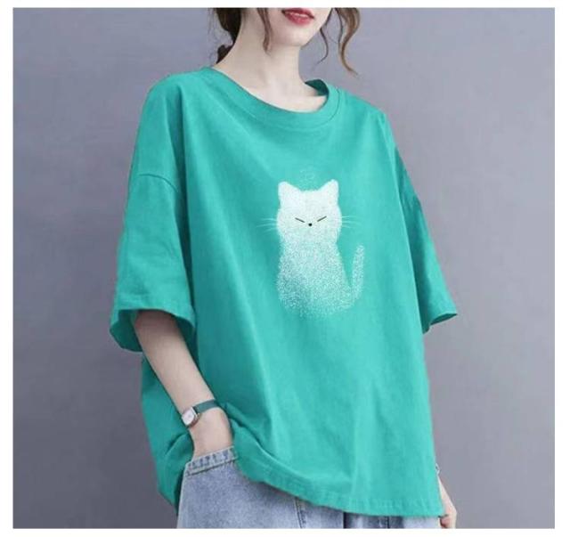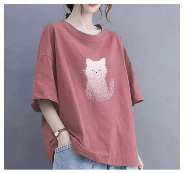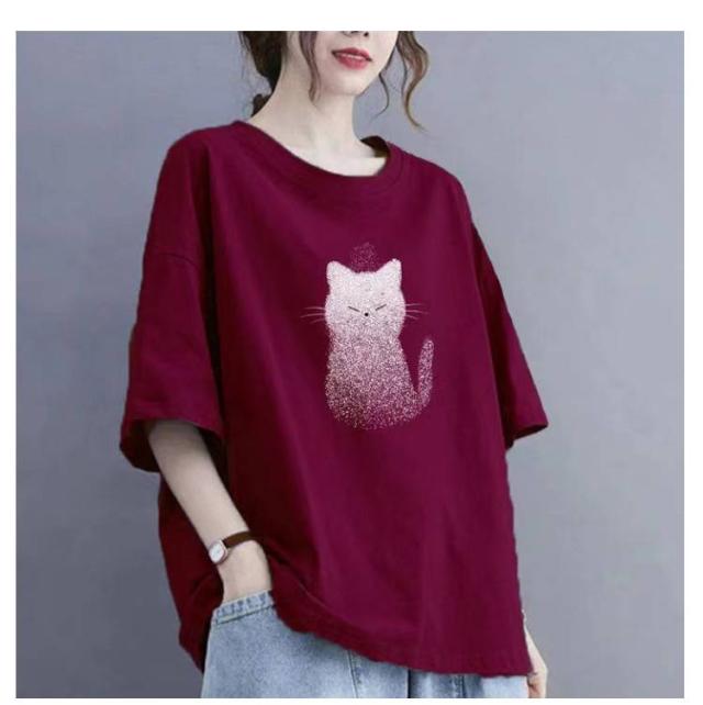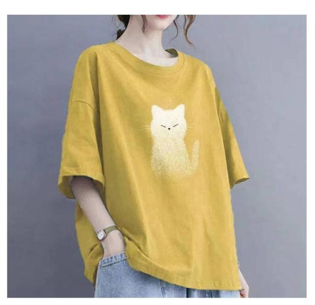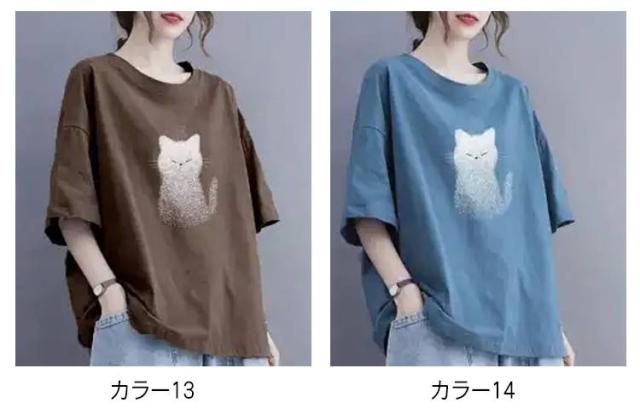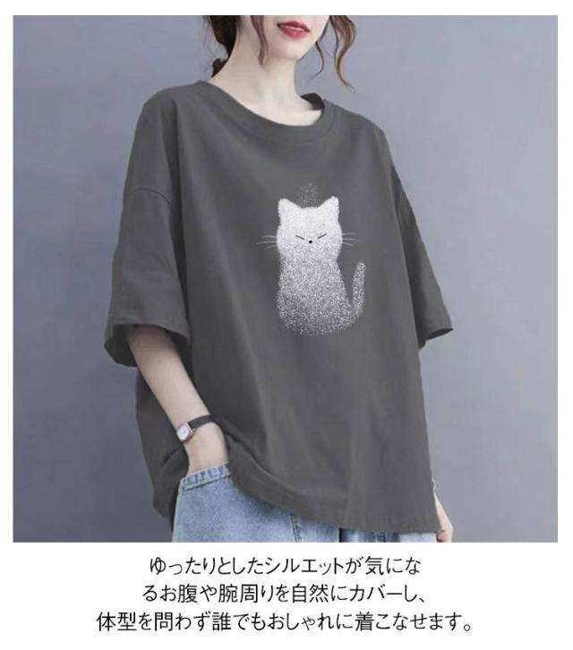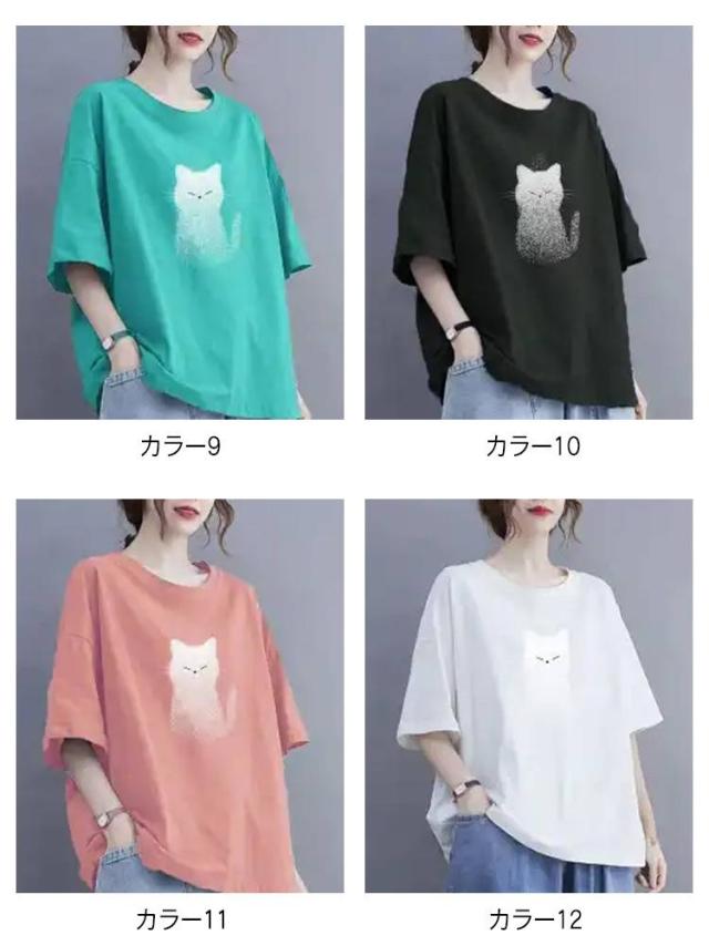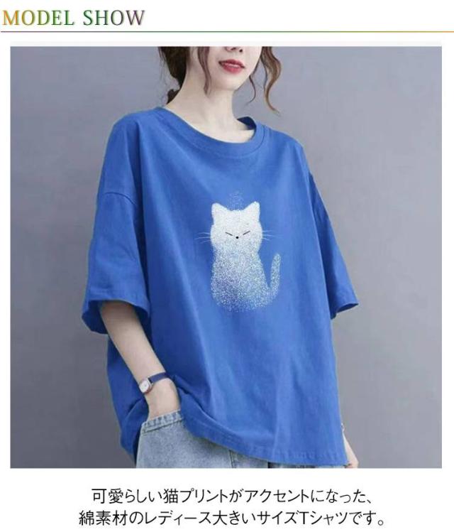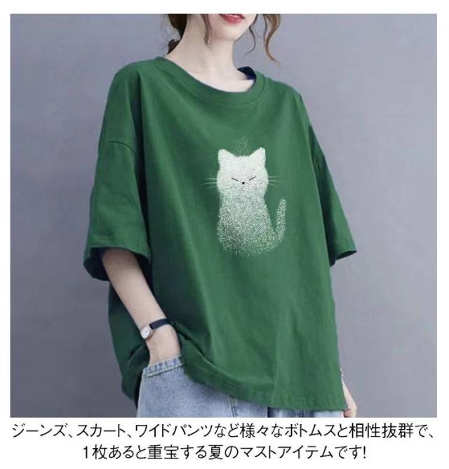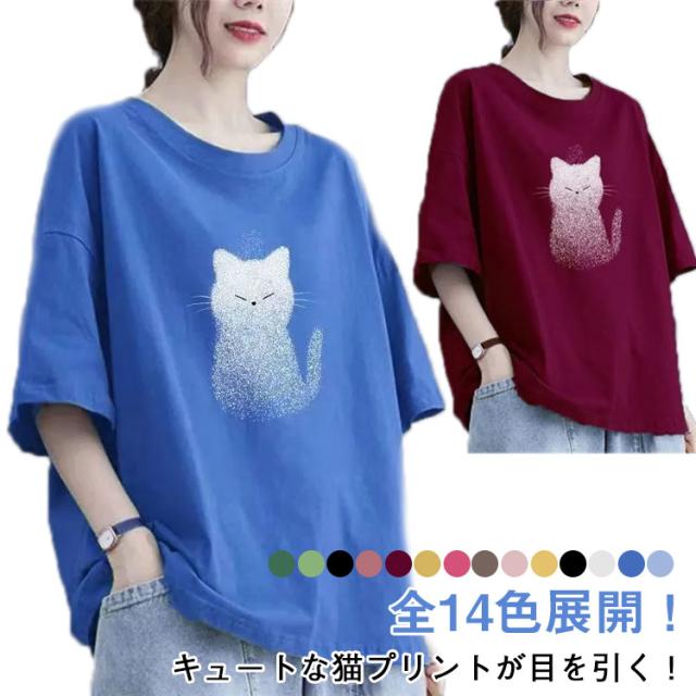 猫プリント 大きいサイズ Tシャツ 半袖Tシャツ ビッグシルエット 綿 トップス ゆったり 体型カバー Tシャツ 猫柄 可愛い 14色展開
