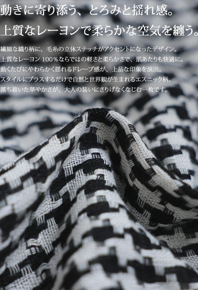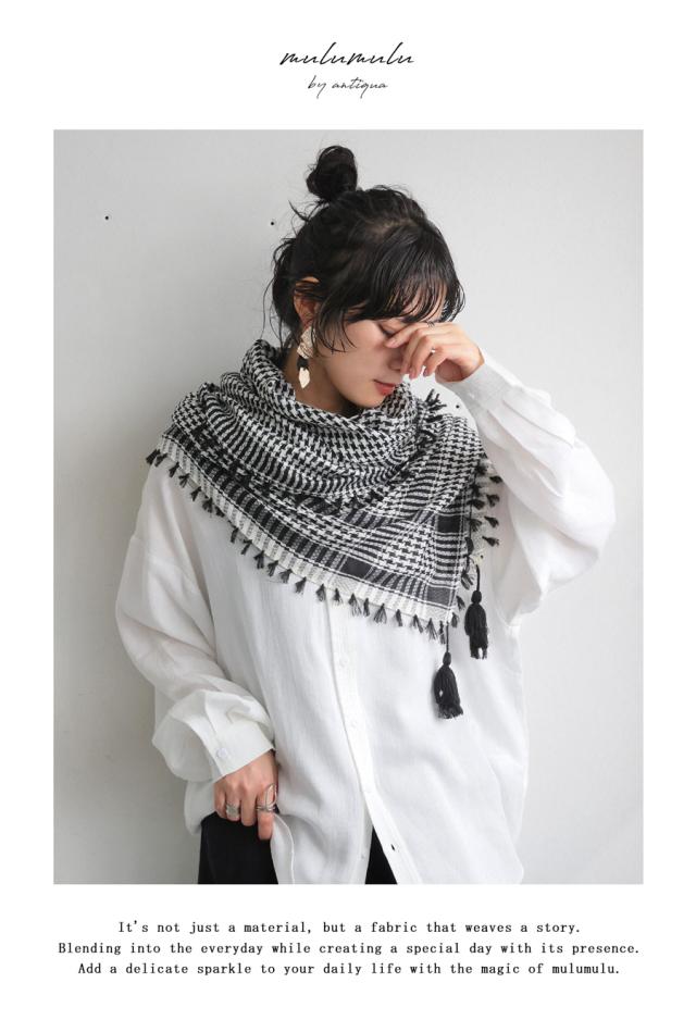 大判サイズの形状で、首元に巻くだけでなく肩掛けや羽織りとしても活躍します。