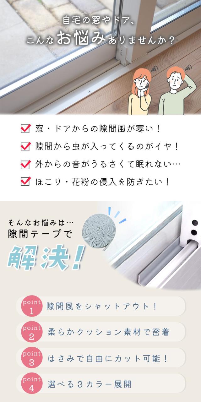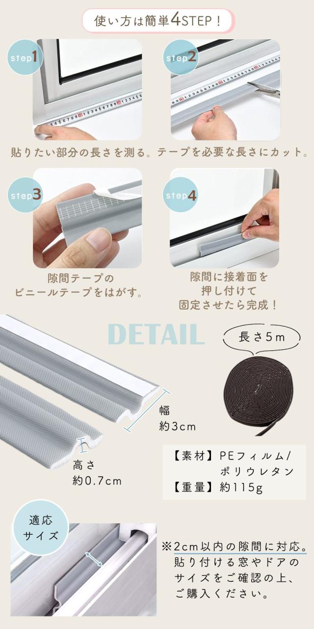 隙間テープ/5m/窓/キッチン/全3色/窓/サッシ/隙間/風/対策/寒さ対策/すきま風/防止/テープ/ドア/すき間/すきま風ストッパー/すきま風防止/遮音/防音/シール/省エネ/隙間風/隙間風対策/ホワイト/グレー/ブラウン/すきまパッキン/戸当たりテープ/隙間ドアテープ/戸当たり/クッション/スポンジテープ/隙間ガード/クッションテープ/隙間埋め/隙間パッキン/防虫テープ/スキマパッキン/ドア用隙間テープ/ドアの隙間を埋める/ドア下/ふさぎ/ドア隙間防音/すき間テープ/すきまテープ/隙間風防止/クッション/スキマテープ/窓/防音テープ/埋め/防水/窓/玄関/室内/網戸/防虫/すきま/ストッパー