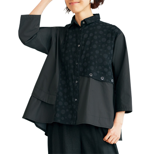 ジャカード切替えシャツ ブラック シャツ ブラウス 立ち襟 七分袖 ドット柄 デザインシャツ レディース 婦人服 ミセス シニア 女性 黒 フレア 体型カバー オシャレ モード シニアファッション 40代 50代 60代 70代 80代 90代 母の日 お母さん おばあちゃん 春物 夏物 春夏
