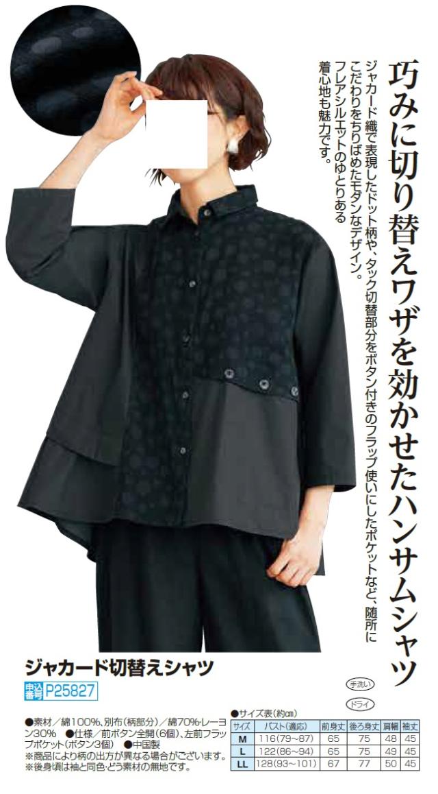 ジャカード切替えシャツ ブラック シャツ ブラウス 立ち襟 七分袖 ドット柄 デザインシャツ レディース 婦人服 ミセス シニア 女性 黒 フレア 体型カバー オシャレ モード シニアファッション 40代 50代 60代 70代 80代 90代 母の日 お母さん 春夏 nss p25827