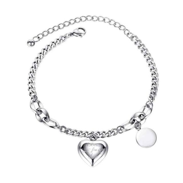 ブレスレット レディース 18k ピングゴールド チタン腕輪 円形 心形 心型 ハート ブレスレット 愛の言葉 刻印 喜平チェーン ブレスレット サイズ調整可能 ニューヨークスタイル バレンタインデー プレゼント (シルバー)