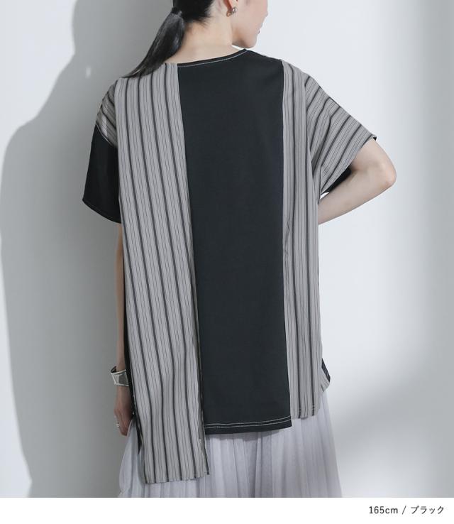 『ストライプ切替ドルマンカットソー』※メール便可※【10】[カットソー 半袖 レディース トップス Tシャツ ドルマンスリーブ ストライプ柄 刺繍 アシンメトリー カジュアル モード 春 夏]