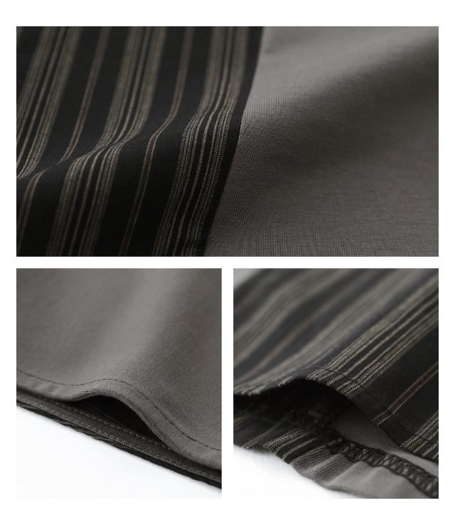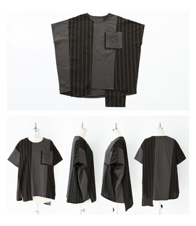 ■デザイン 天竺カットソーと布帛ストライプをアシンメトリーに切り替えたドルマンカットソー。ポケットには刺繍デザイン入りで、さりげなくアクセントをプラスしています。楽に着用できるゆるっとしたシルエットですが、ストライプで縦のラインを強調しすっきり見えが叶います。 ■コーディネート カジュアルにもモードにも着られるアイテム。パンツとの組み合わせはもちろん、フレア感のあるスカートと合わせてもバランス良く着こなすことができ、ほんのりと女性らしさもプラスできます。シンプルなボトムスと合わせて、Tシャツを主役にするコーディネートもおすすめです。 ■素材 カットソー部分には、さらりとした肌触りのコットン100%素材を使用。布帛部分には、薄すぎないシャツ素材のストライプ柄を使用しています。 |