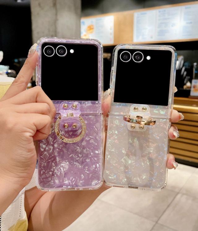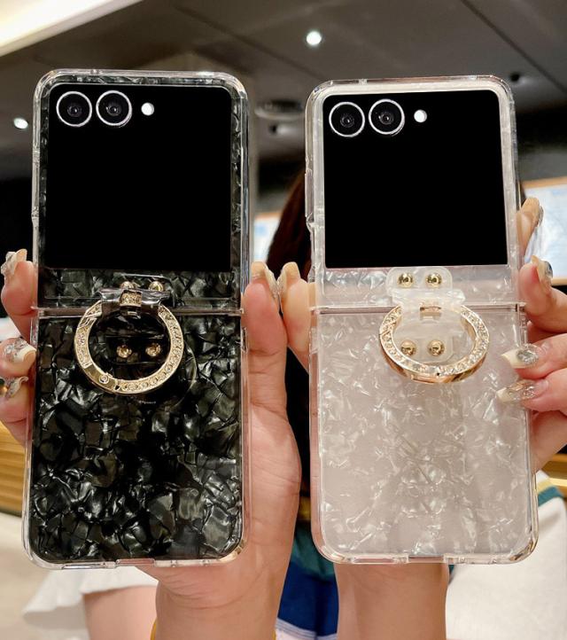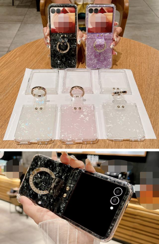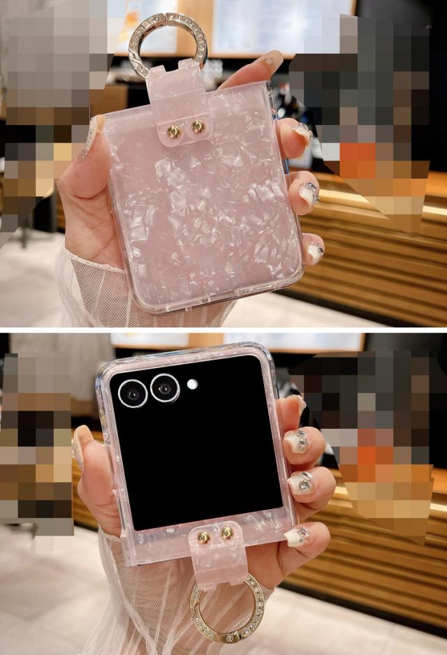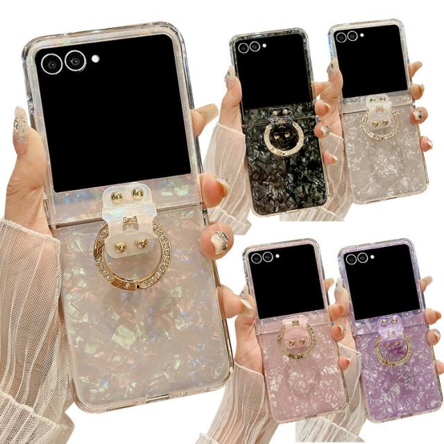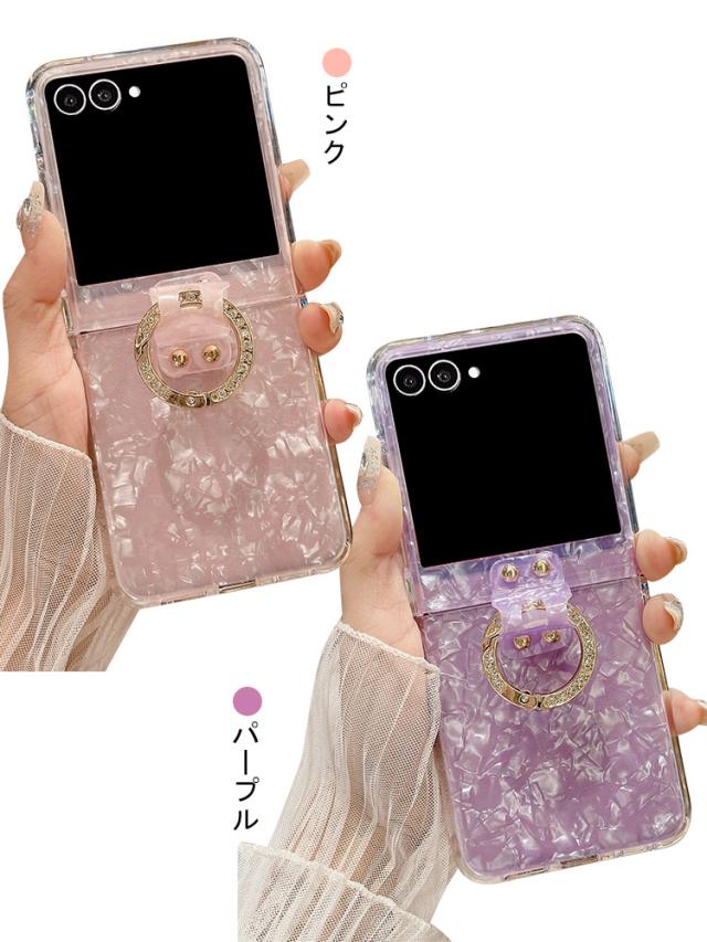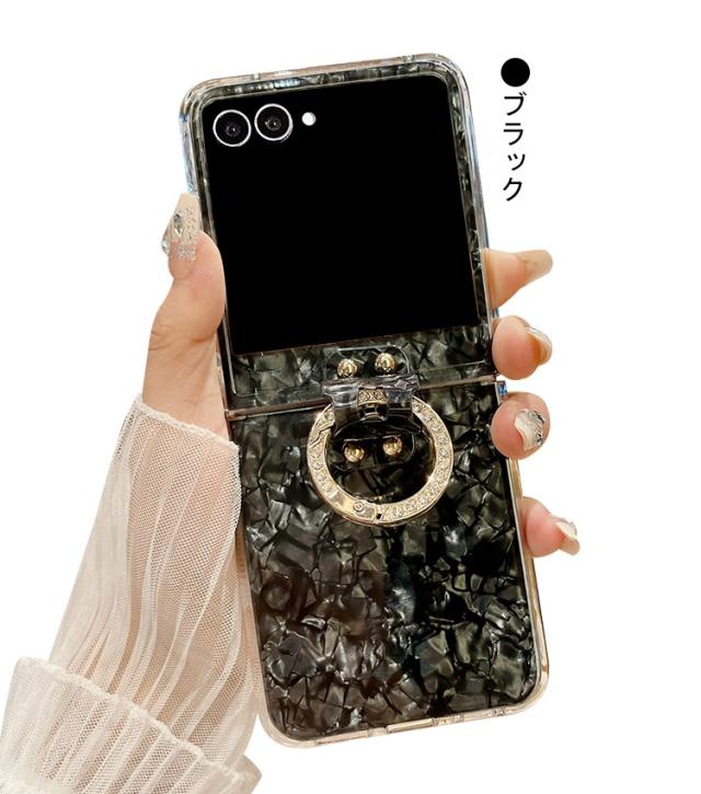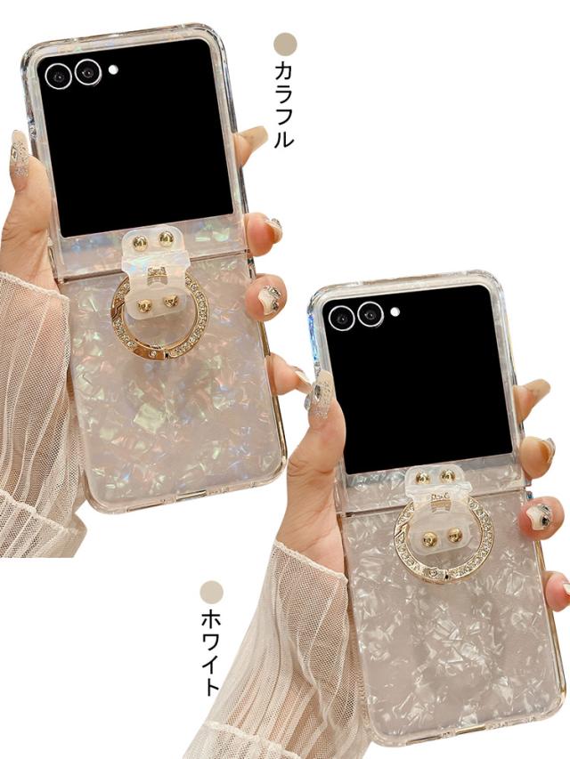 Galaxy Z Flip7 ケース /カバー 折りたたみ型 貝殻風模様 ラインストーン 一体型リング付き 可愛い お洒落 シンプル ハードケース お洒落 Samsung サムスン ギャラクシー Z フリップ7 保護ケース アンドロイド おすすめ