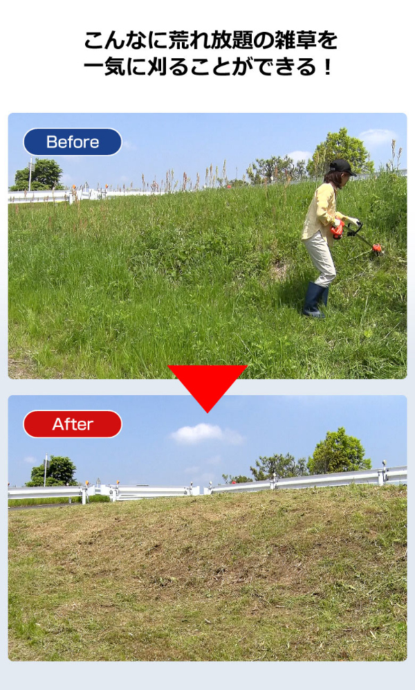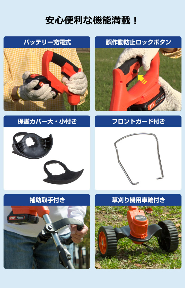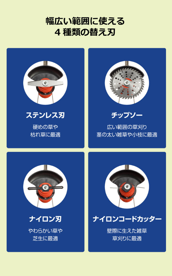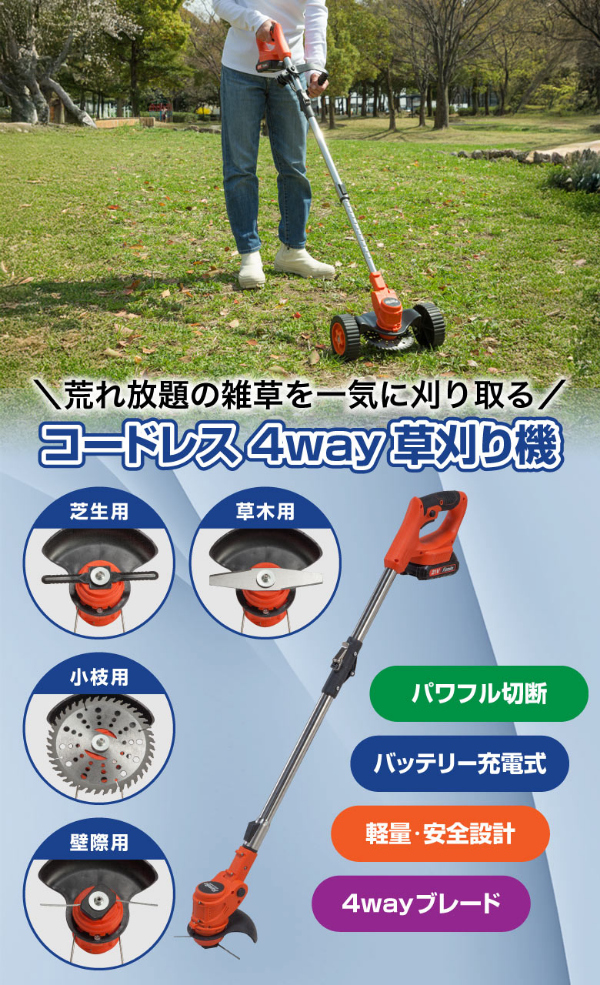 これ1台で庭のお手入れが楽になる!庭や芝生のお手入れ、広場の草むしりや草刈りを効率的に行うために欠かせないコードレス4WAY草刈り機です。作業時にかがむ必要がなく、背中や腰への負担を大幅に軽減。作業効率も大幅にアップします。充電式コードレスの為、場所を選ばずどこでも使用可能です。【草の種類に合わせて4種の替え刃を使い分け】●ナイロン刃:やわらかい草・芝生●ステンレス刃:硬めの草・枯れ葉●チップソー:幹の太い雑草・竹●ナイロンコードカッター:壁際に生えた雑草。軽い力で楽々作業が捗る補助輪付き!重量が分散されることで、腕や肩への負担が軽減できます!身長や腕の長さに応じて長さ調整ができ、切断角度により調整が可能です。折り畳み式なので、持ち運びも便利。倉庫やスペースへの収納も邪魔になりません。安全面にも配慮。スイッチは誤作動防止の安全ロックボタン付きのダブルスイッチ、安全保護カバー、フロントガードで草刈り時の危険をガードします。庭や芝生のお手入れを手軽に行いたい方、これからの季節にピッタリなアイテムです。