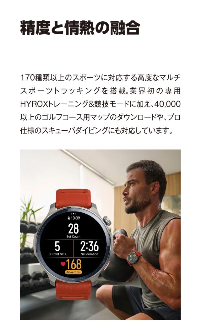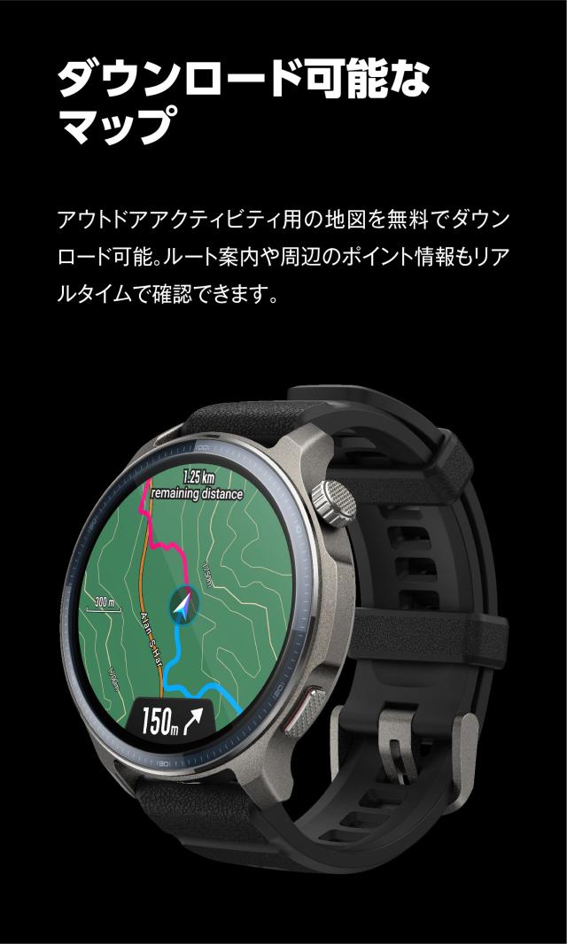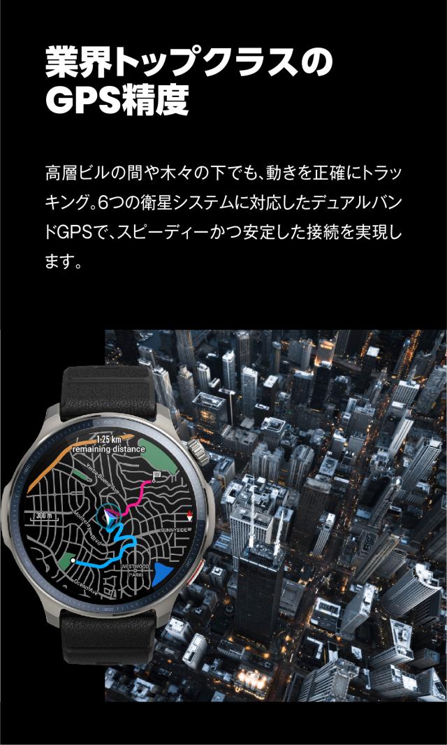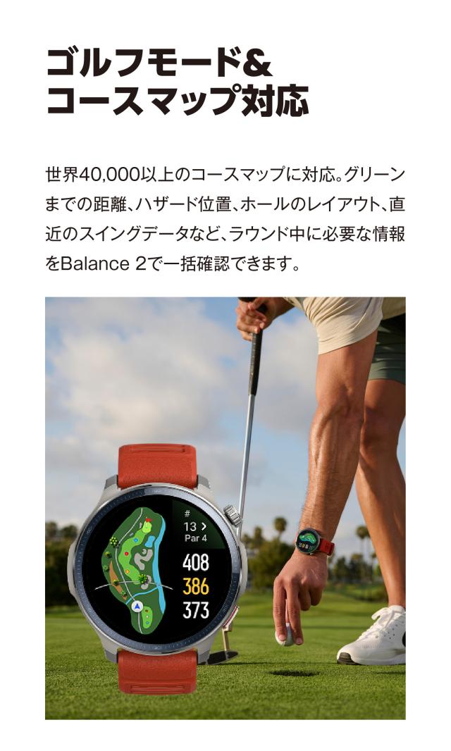 Amazfit製品史上初めて、ゴルフラウンド機能を搭載。世界中の約40,000コースのダウンロードが可能で、グリーンまでの距離、ハザード、ホールのレイアウト、最後のスイング指標など、ラウンド中のゴルフ完全体験をサポート。