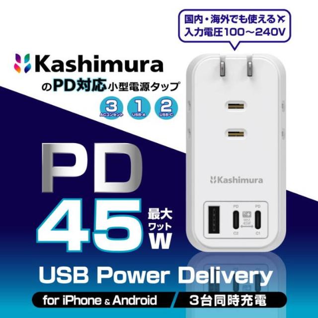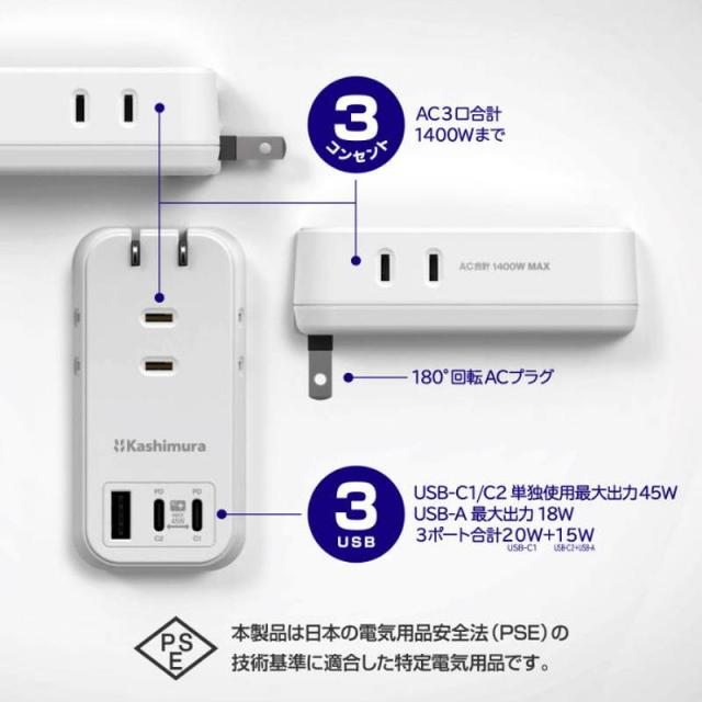 電源タップ AC充電器 3口 Type-C 2ポート 45W PD高速充電/リバーシブルUSB-A 1ポート/3コンセント
