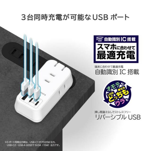 ●3口のACコンセントとUSB PD対応USB Type-C 2ポート+USB-A 1ポート搭載の電源タップ。