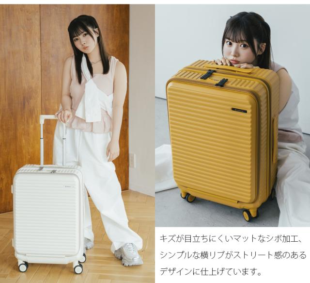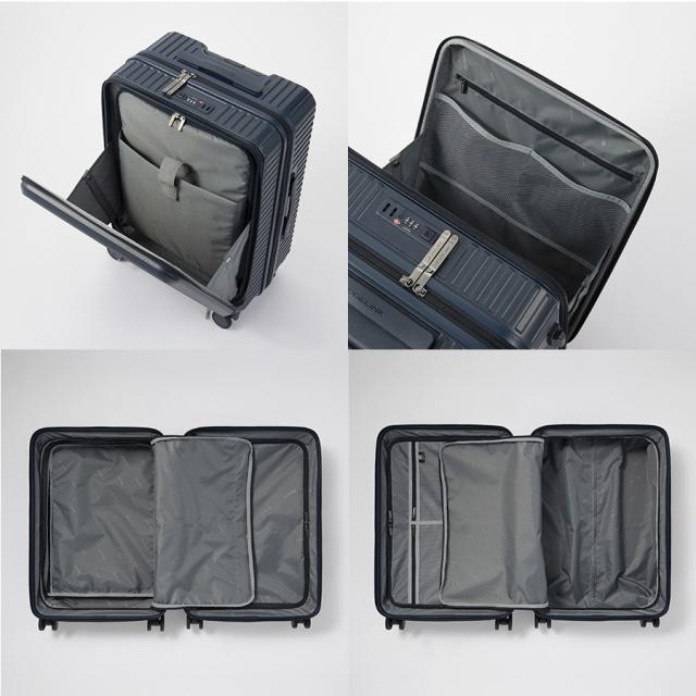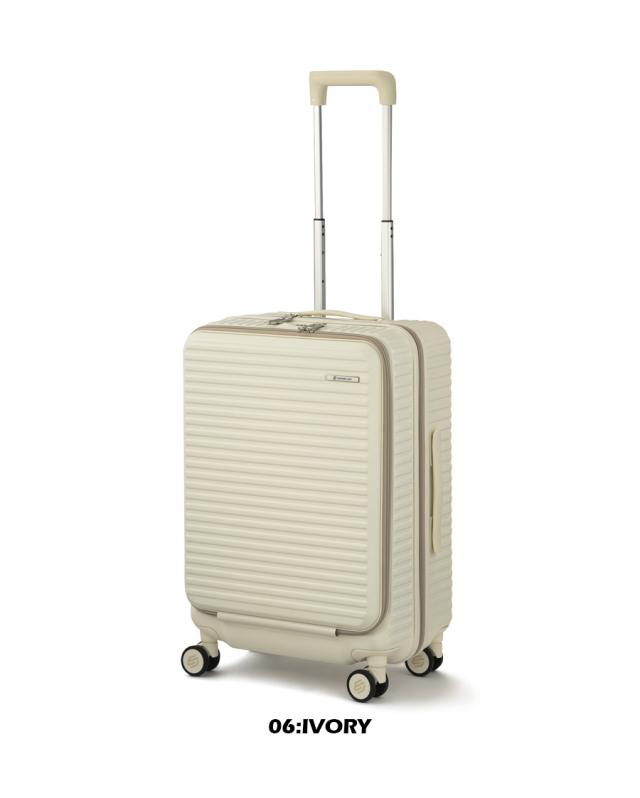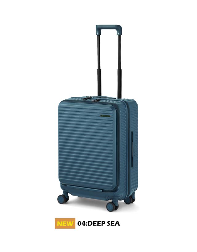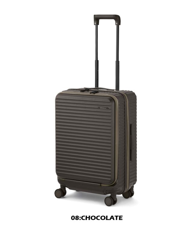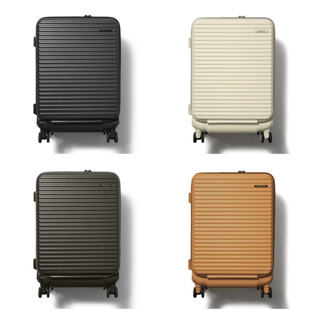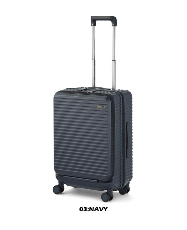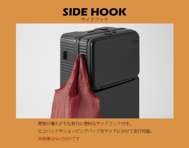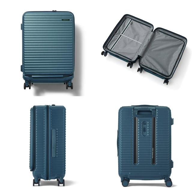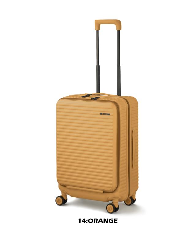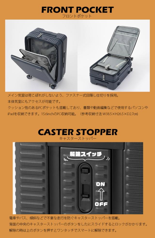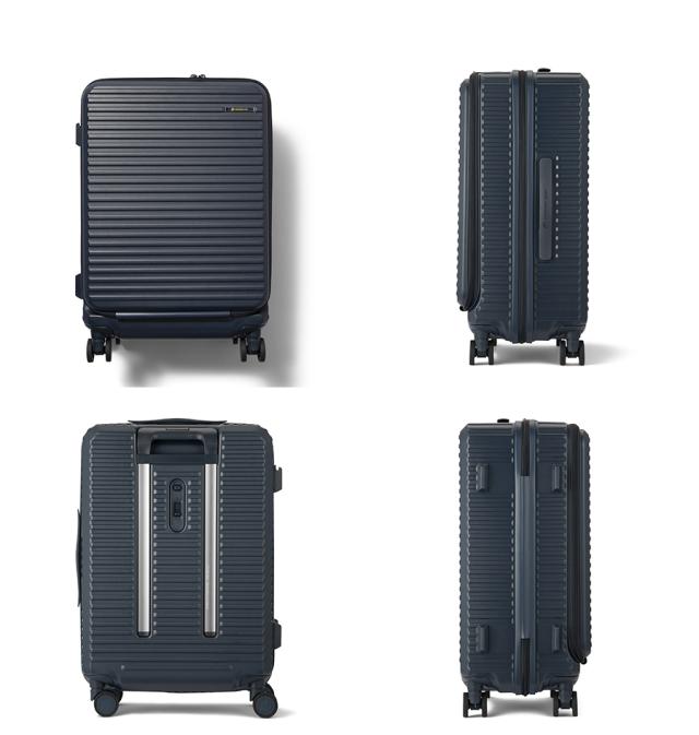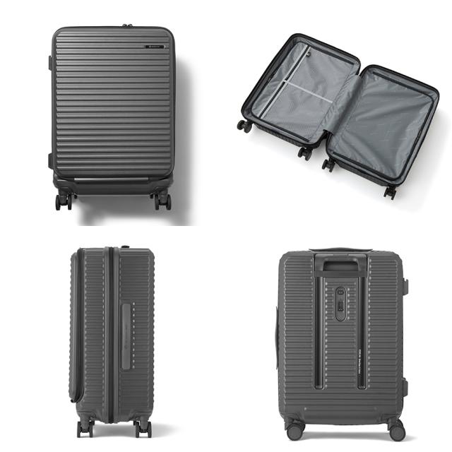機能一覧:機内預け入れ/4輪/双輪キャスター/TSダイヤルファスナーロック/フロントオープン/キャスターストッパー/サイドフック