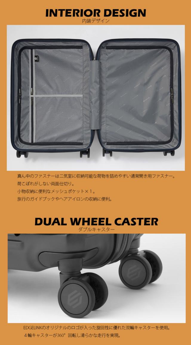 『ストリートテイストなデザイン』×『機能性』をコンセプトに『EDGELINK』のスーツケース『CRUZBOX(クルーズボックス)』がついに登場。 トレンドのフロントポケットタイプに、便利な『キャスターストッパー』を搭載。 キズが目立ちにくいマットなシボ加工、シンプルな横リブがストリート感のあるデザインに仕上げています。 自由度が高く、個性的な表現のストリートファションにも合わせやすいカラー展開です。