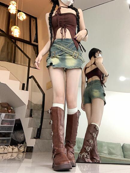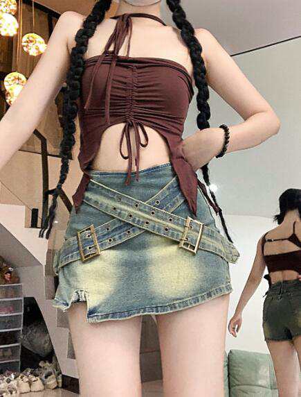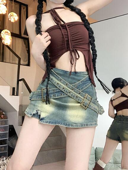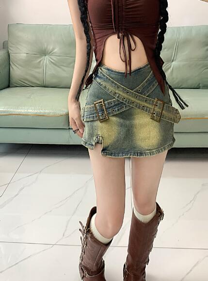 ♪S~XL展開♪ベルトスカート スカパンデニム ブルー青シンプルハイウエストミニスカミニ膝上ひざ丈ボトムスダンス衣装ヒップホップHIPHOPレディースガールズkpop韓国ストリート